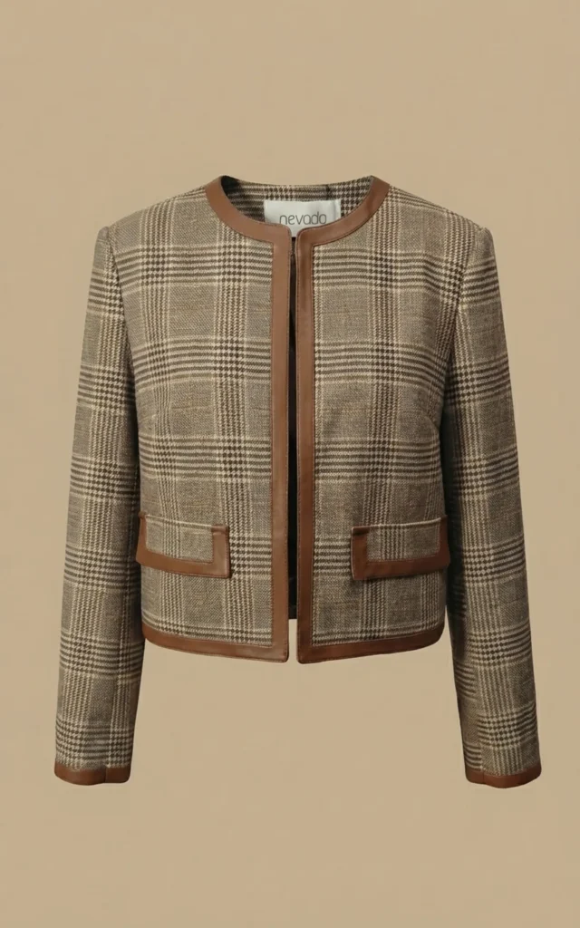 ژاکت زنانه چهارخانه قهوهای یقه گرد با لبهدوزی نوادو کد 404113251656