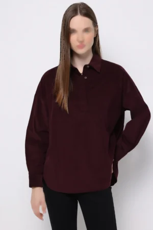 شومیز زنانه مخمل کبریتی زرشکی با یقه نیمدکمه و تنخور آزاد برند کلینز کد CL1077327