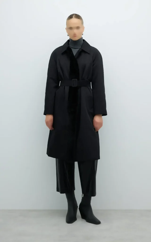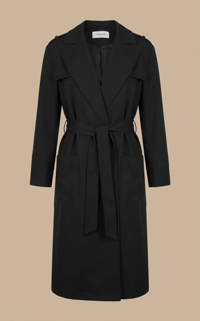 بارانی زنانه مشکی بلند کمردار با یقه انگلیسی نوادو کد 404132011765