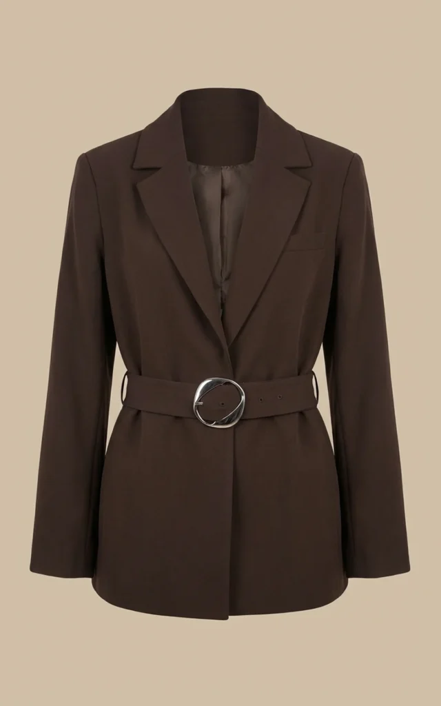 کت زنانه قهوهای کمردار با یقه انگلیسی بلند نوادو کد 404113141816