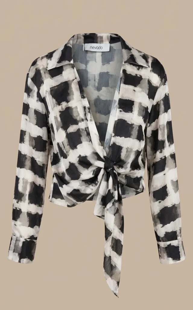 بلوز زنانه چهارخانه گرهای با یقه کلاسیک باز نوادو کد 404112061728