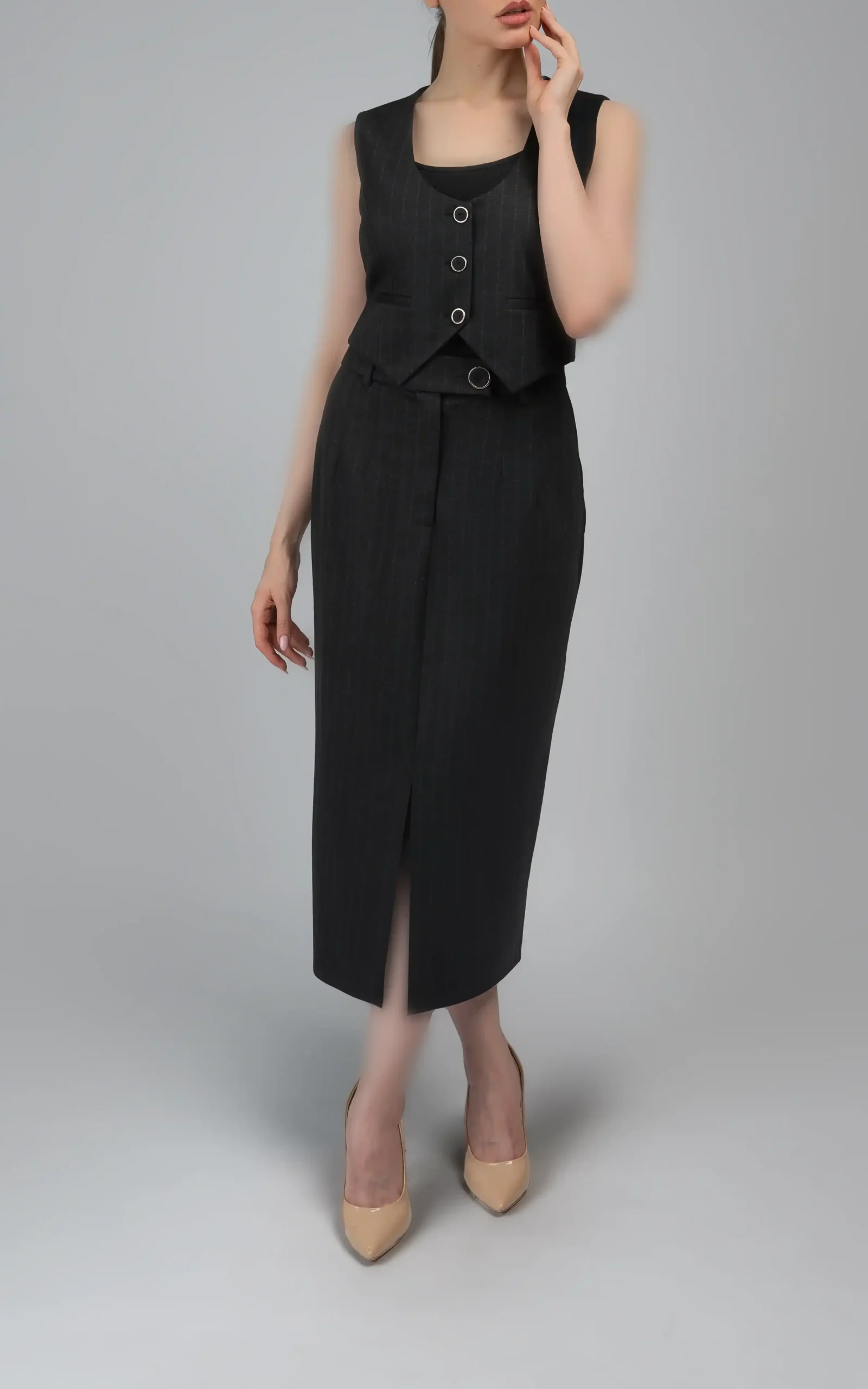 خطوط راه راه ظریف و محو کار شده در پارچه این دامن زنانه، به زیبایی آن افزوده و به گونهای است که ست آن به همراه یک تاپ یا بلوز جذب و کوتاه مشکی یا به همراه رنگهای متضادی مانند قرمز یا زرشکی و یا به همراه جلیقه جذب، کوتاه و مشکی ست آن، استایل شیک و یونیکی را به اندام بانوان میبخشد.