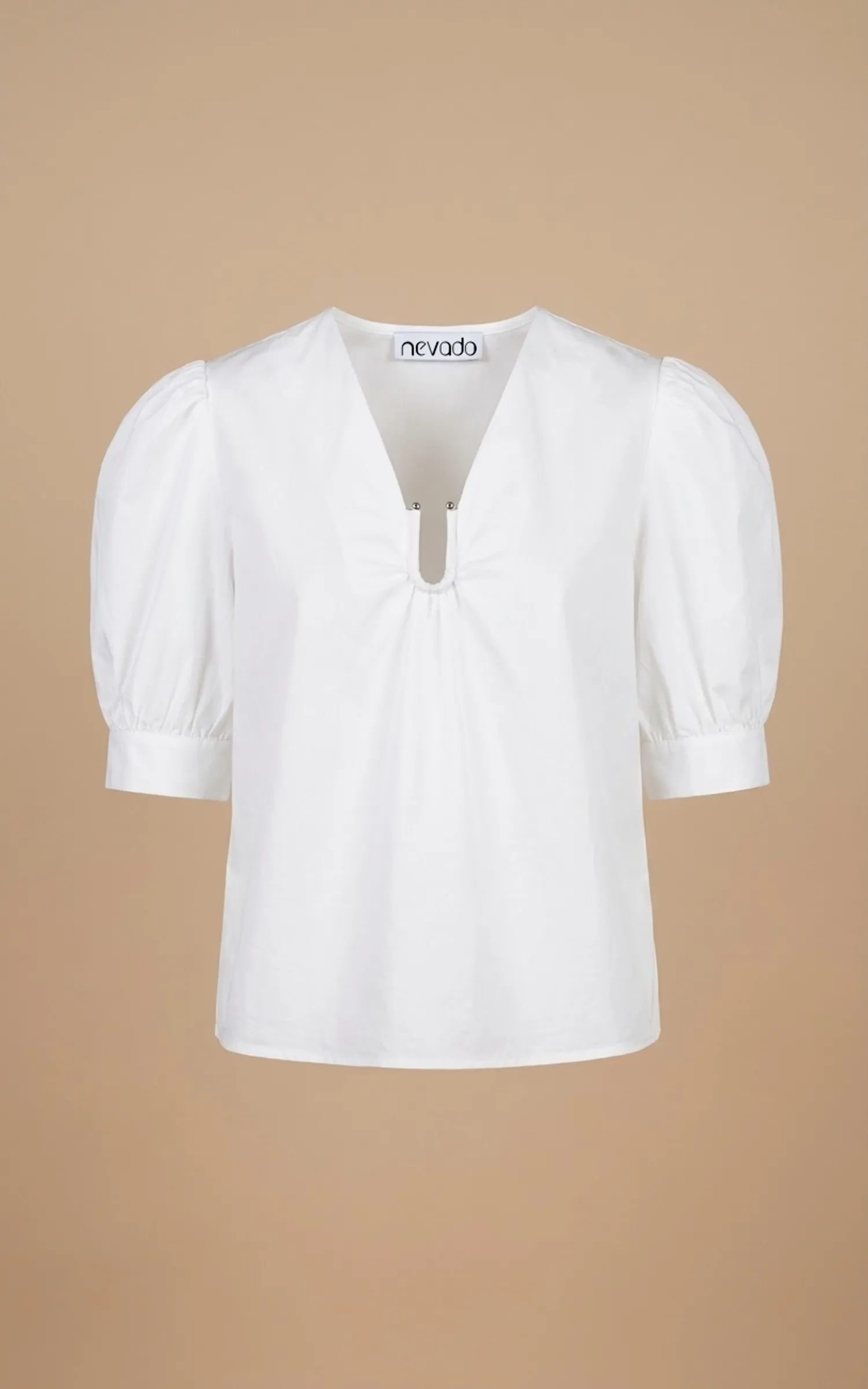 مدل ظریف و دوخت منحصر به فرد کار شده در نمای یقه پیراهن سفید رنگ زنانه نوادو، آنرا به یک انتخاب شیک و خاص برای میهمانیهای مجلسی و مورد پسند بانوان علاقهمند به تناژ رنگی روشن تبدیل کرده است.