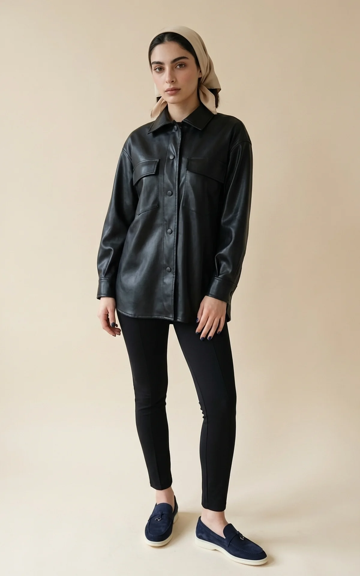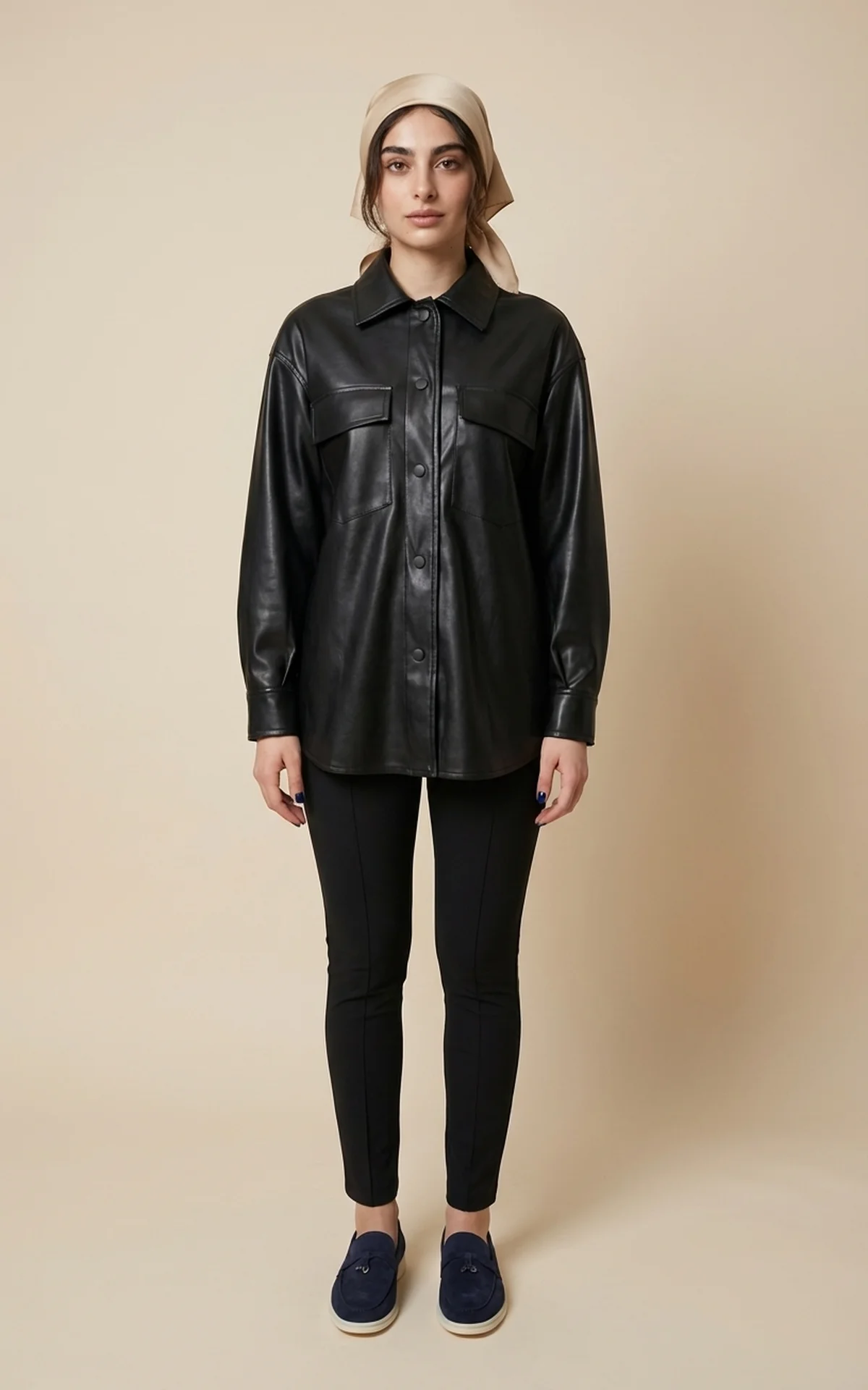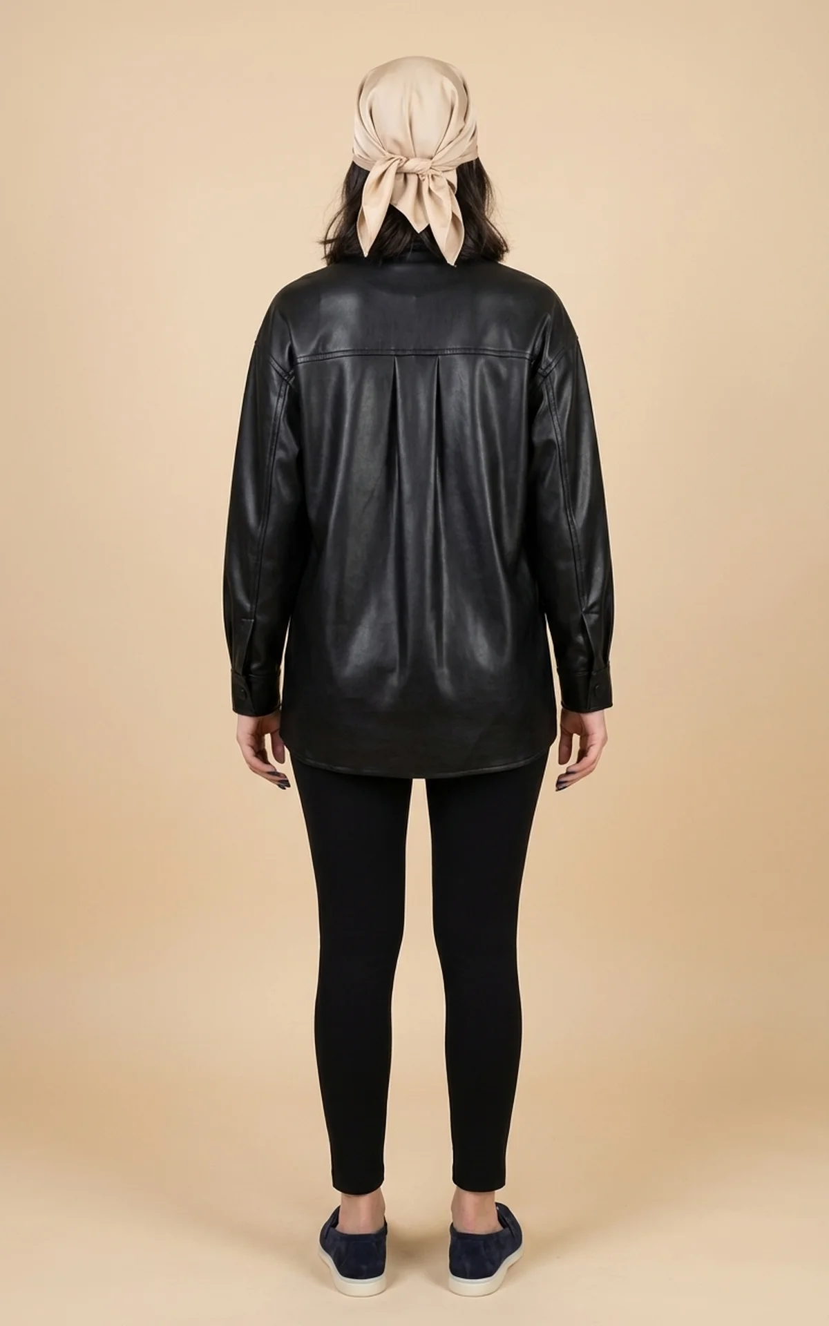 پیراهن زنانه چرمی مشکی دکمهدار با دو جیب نوادو کد 404113161591