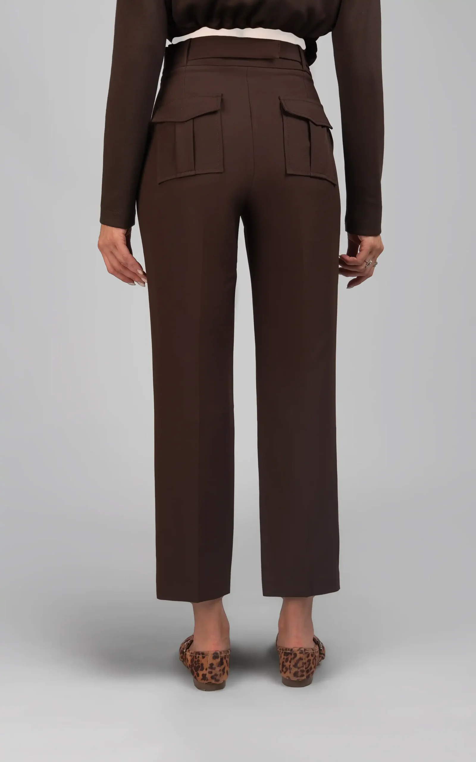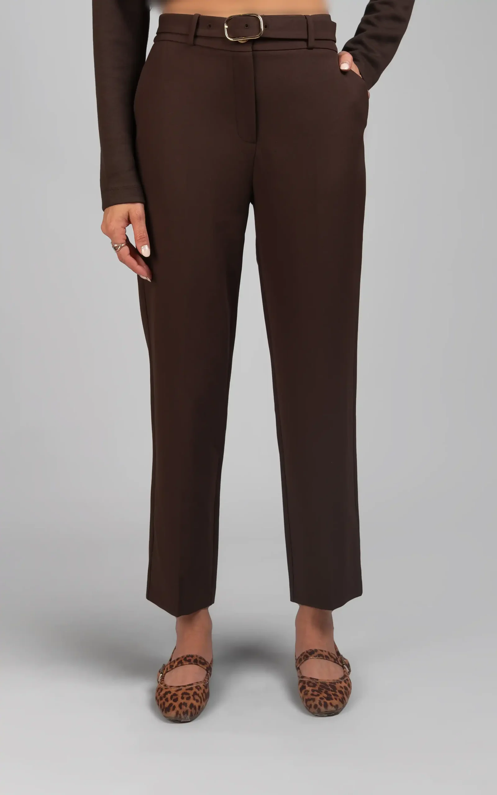 فاق جذب و بلند، کمربند باریک، سگک دار و قهوهای رنگ در قسمت فاق، جیبهای ظریف دوخته شده در هر دو طرف و مدل شلوار که نسبتا به صورت جذب بر روی تن میایستد، شظاهر شیک و موقرانهای را به استایل بانوان میبخشد.