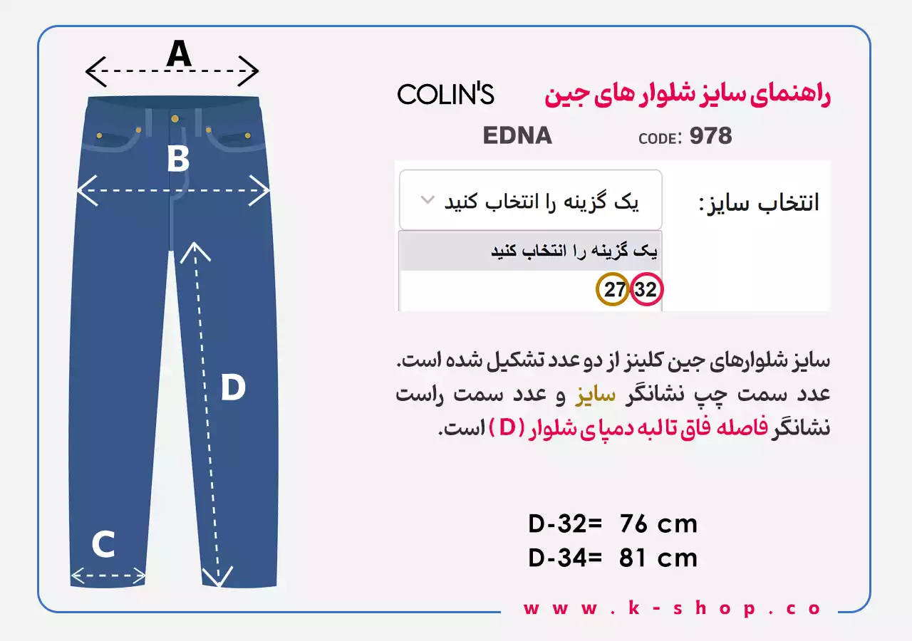 راهنمای سایز شلوار زنانه کلینز ۹۷۸