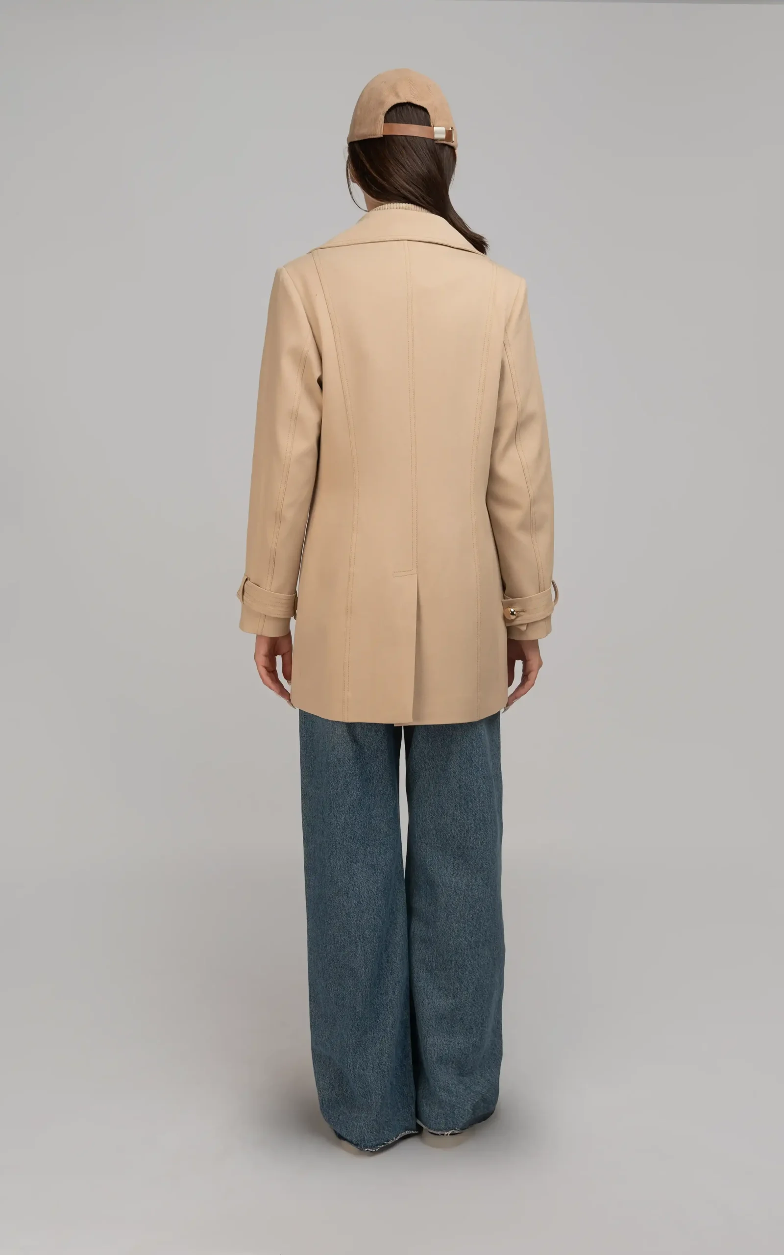 یقه انگلیسی نسبتا پهن، شش دکمه نسبتا درشت و طلایی رنگ کار شده در موازای هم در نمای میانی، دو جیب ظریف دوخته شده در هر دو طرف و آستینهای بلند و بند باریک کار شده در بالای سرآستینها، به زیبایی مدل این بارانی شیک زنانه افزوده است.