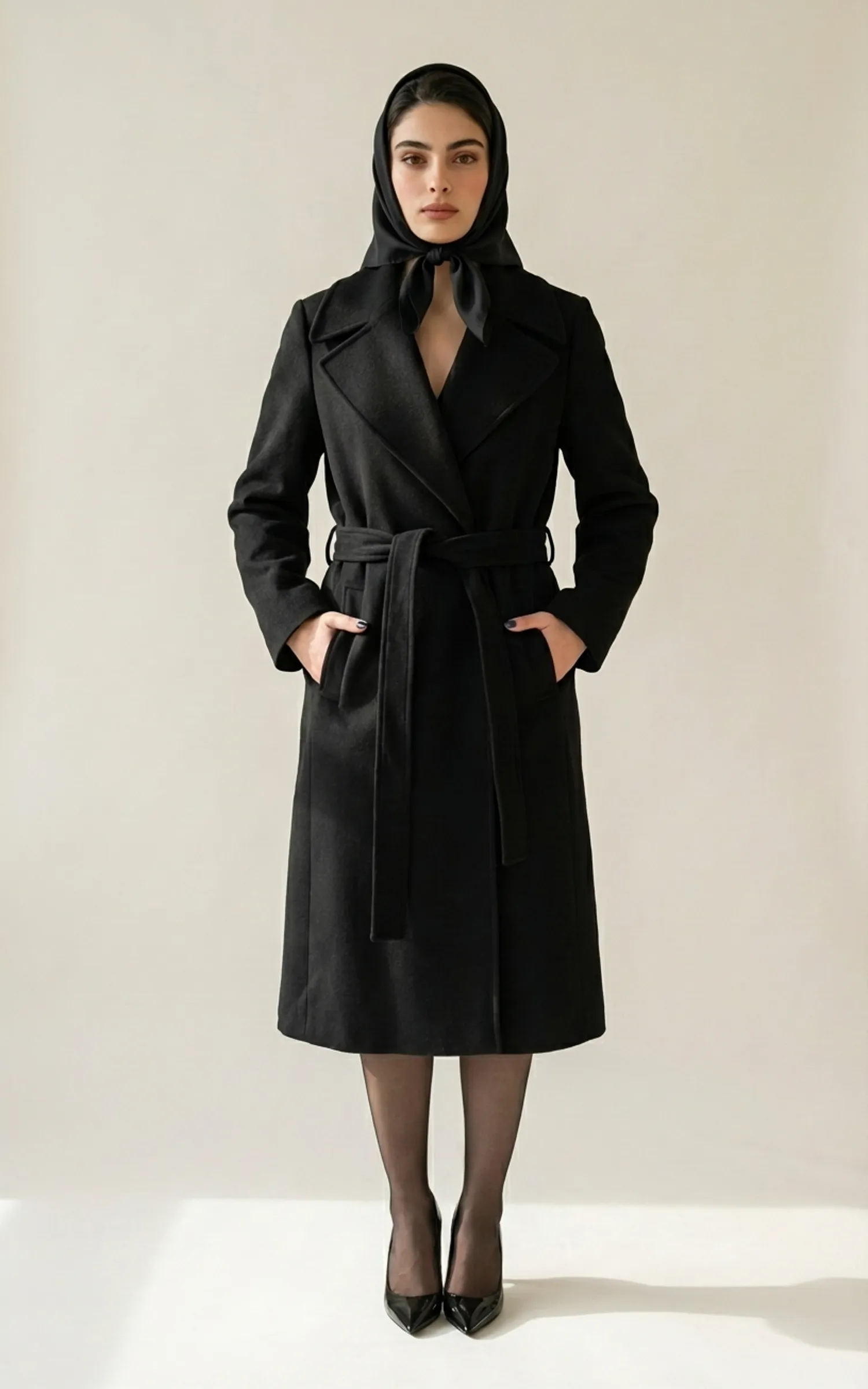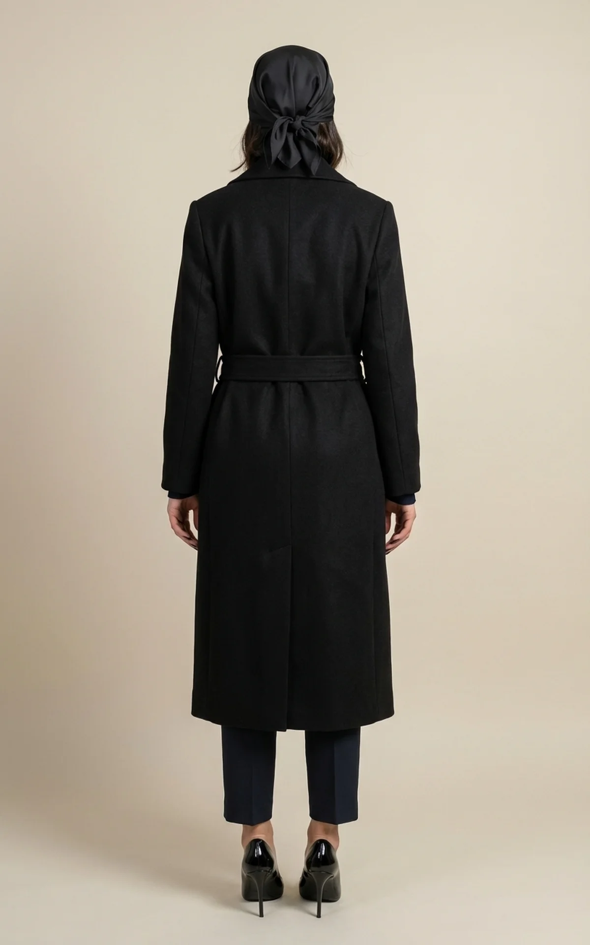 پالتو زنانه مشکی با یقه انگلیسی پهن و کمربند گرهدار پارچهای نوادو کد 404018061712