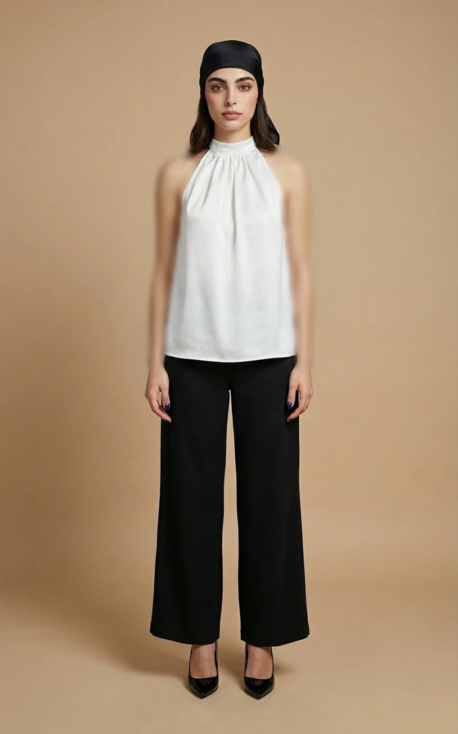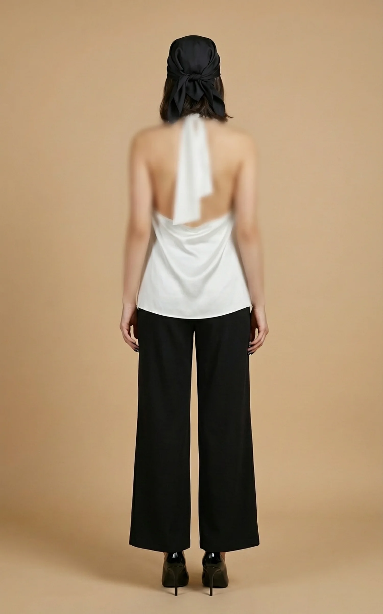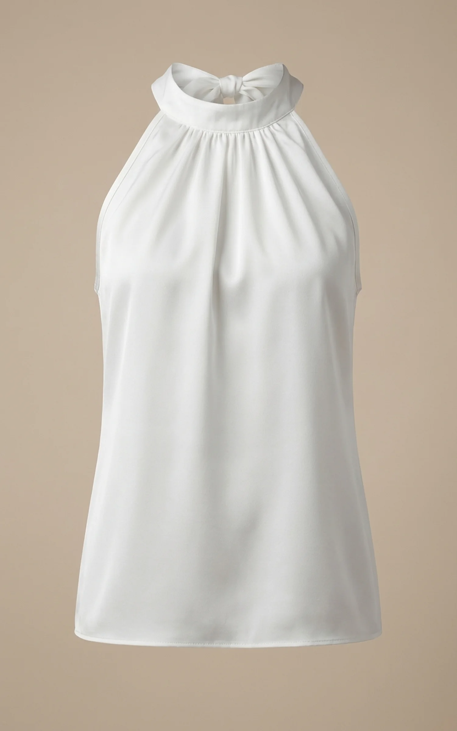 دوخت نسبتا پهن نمای یقه گرد و چسبان تاپ و دو بند نسبتا باریک و لخت متصل به آن که در نمای پشتی یقه گره میخورد و در نمای پشتی قسمت بالاتنه و پشت تاپ قرار میگیرد، ظرافت و زیبایی خاصی را در مدل آن ایجاد کرده است.