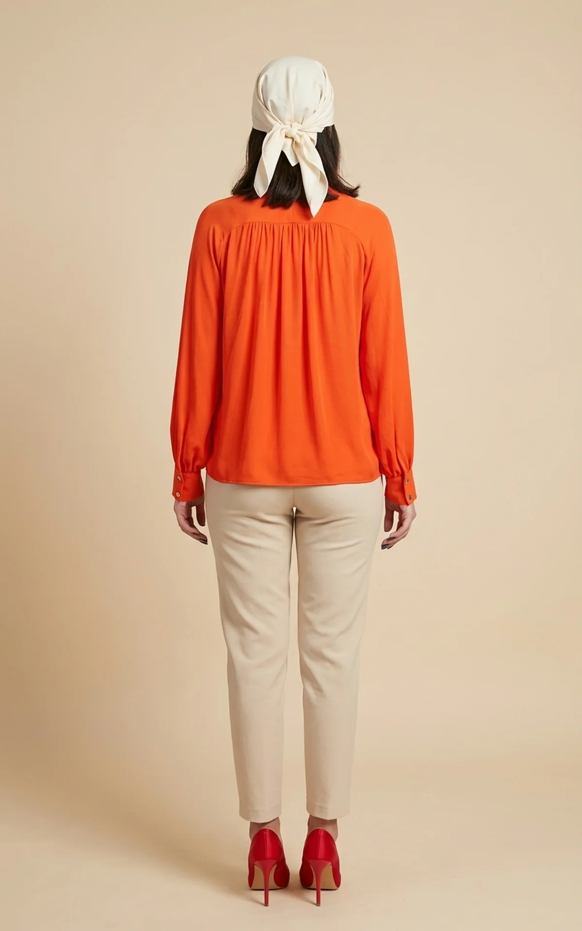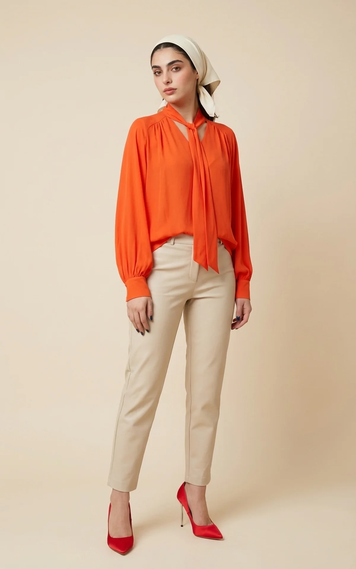 بلوز زنانه نارنجی با یقه کراواتی بلند و آستینهای مچدار نوادو کد 404112371870