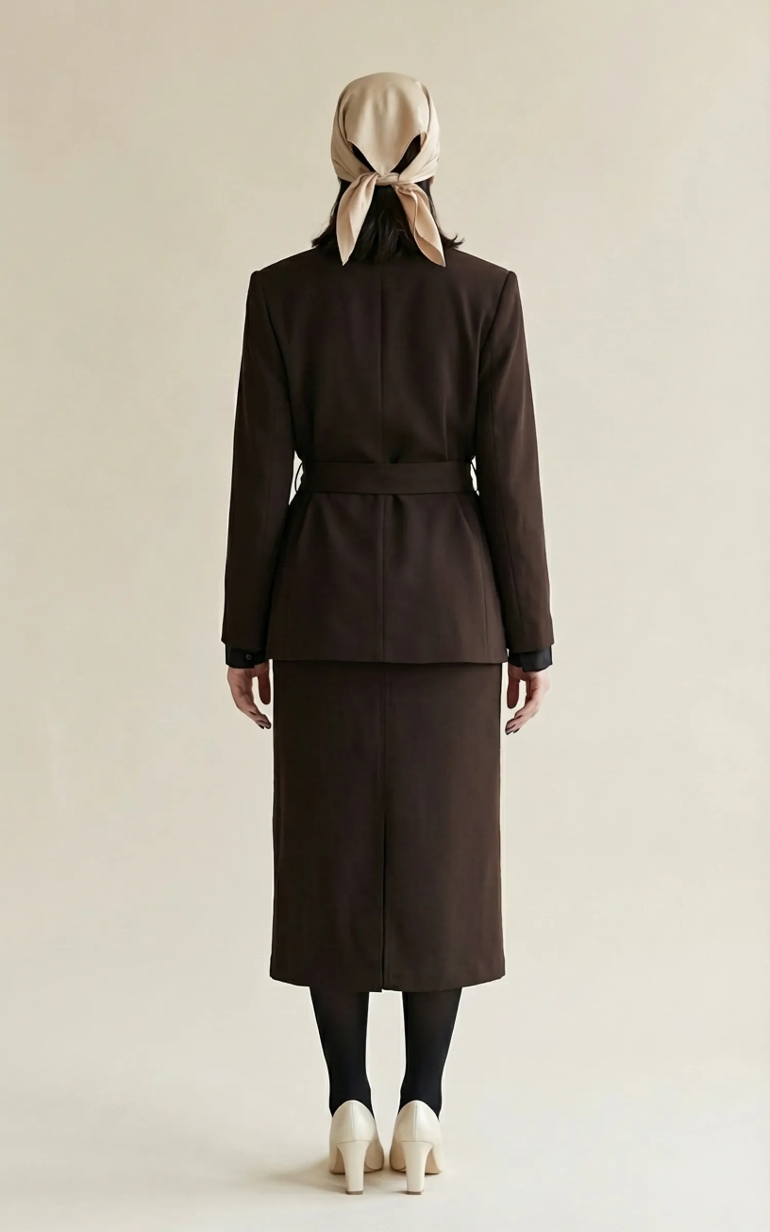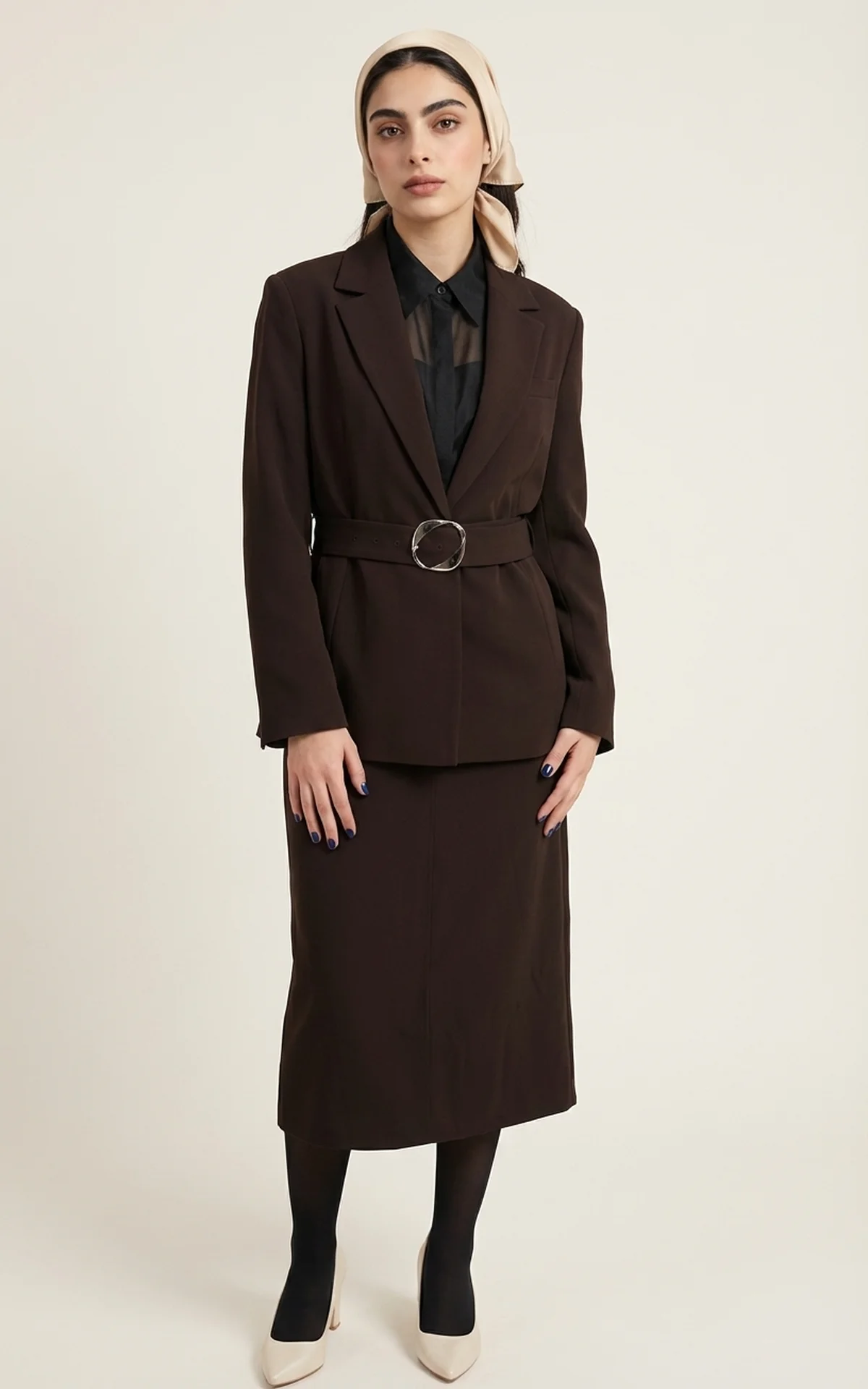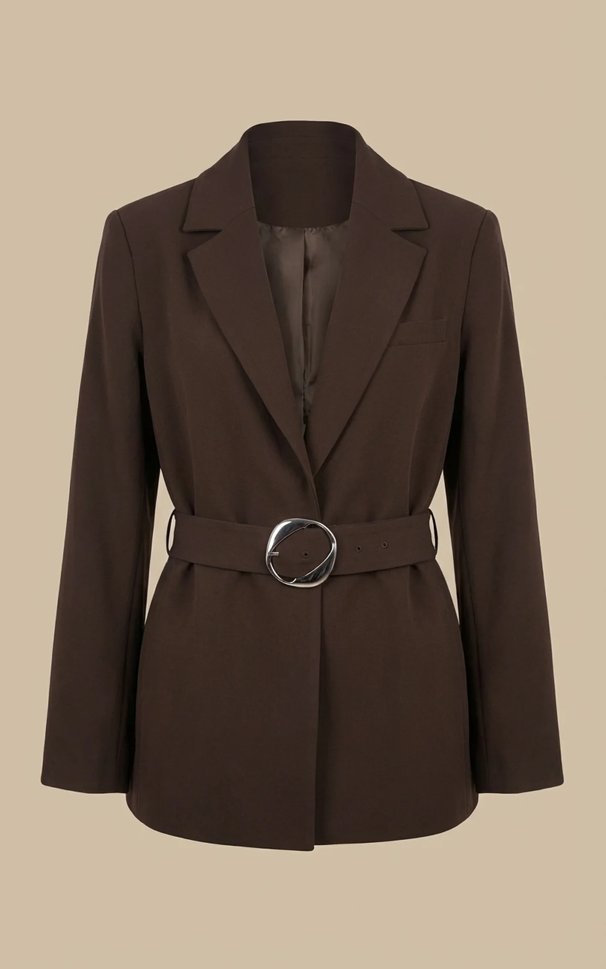 کت زنانه قهوهای کمردار با یقه انگلیسی بلند نوادو کد 404113141816