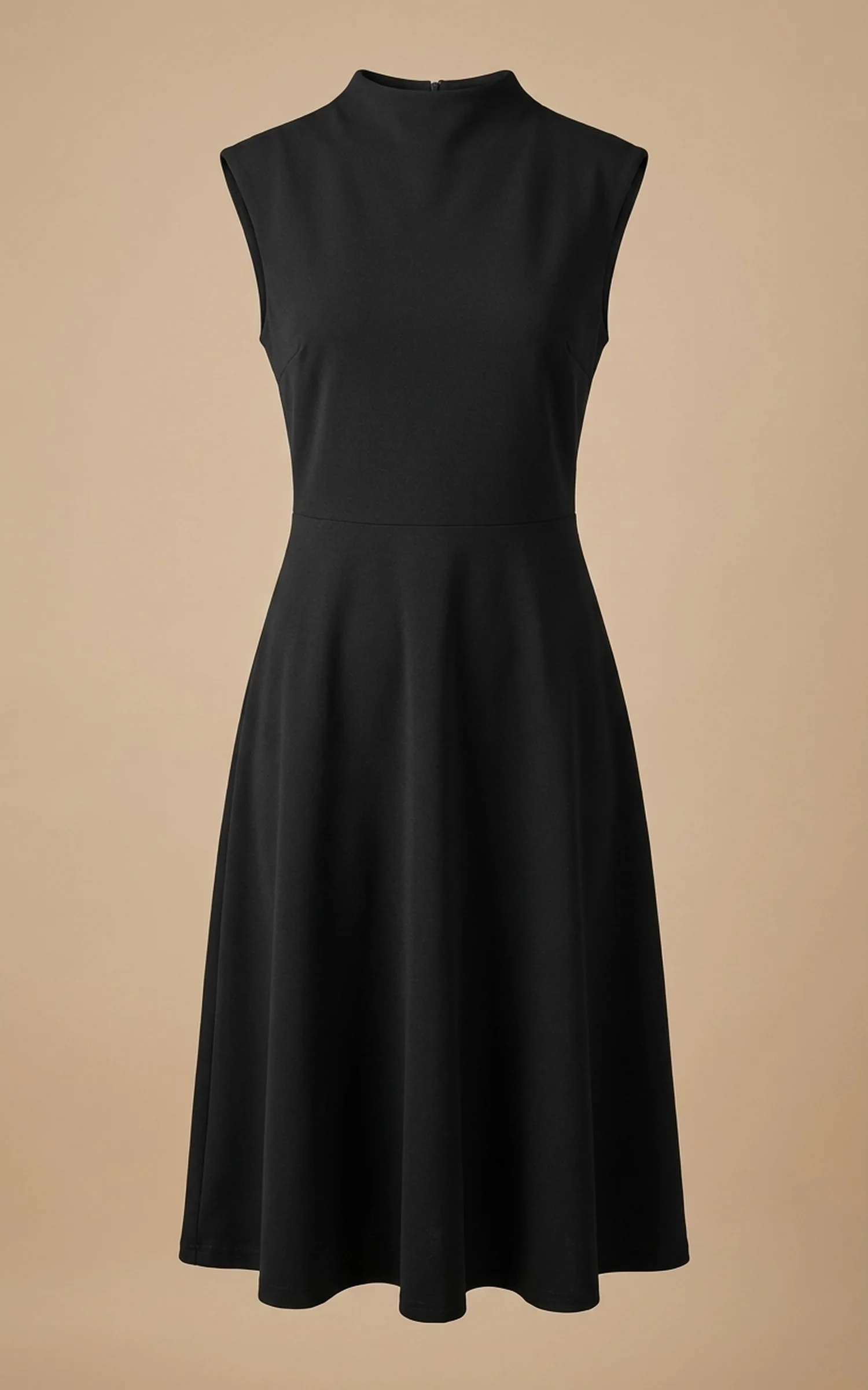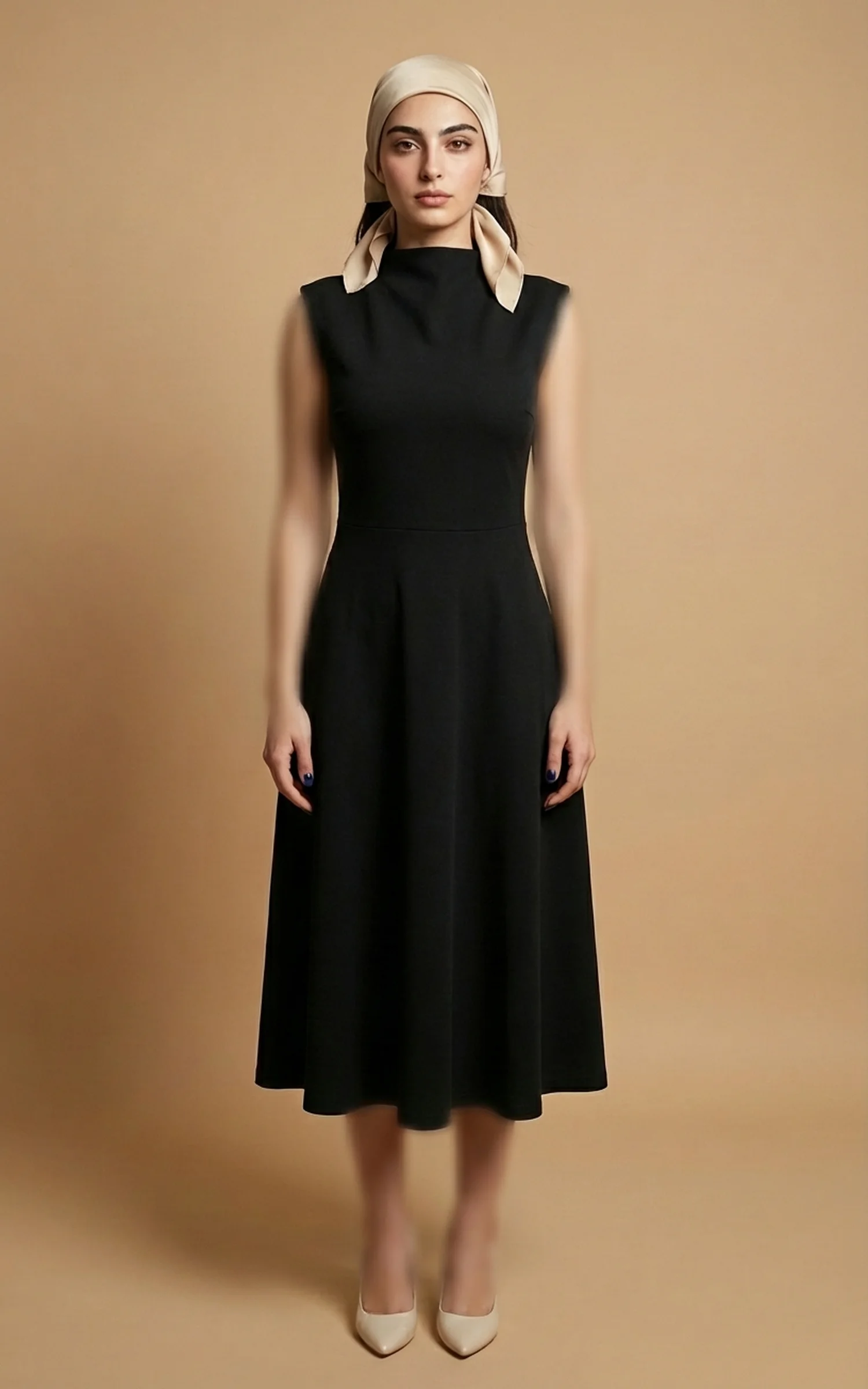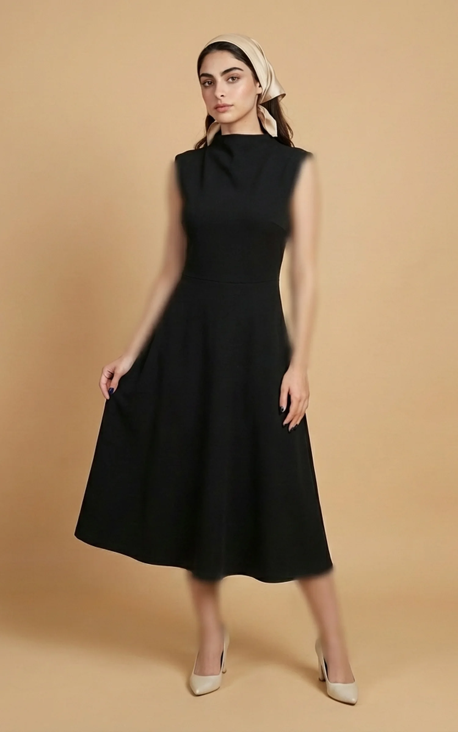 پیراهن زنانه مشکی یقه ایستاده با دامن کلوش نوادو کد 404114361696