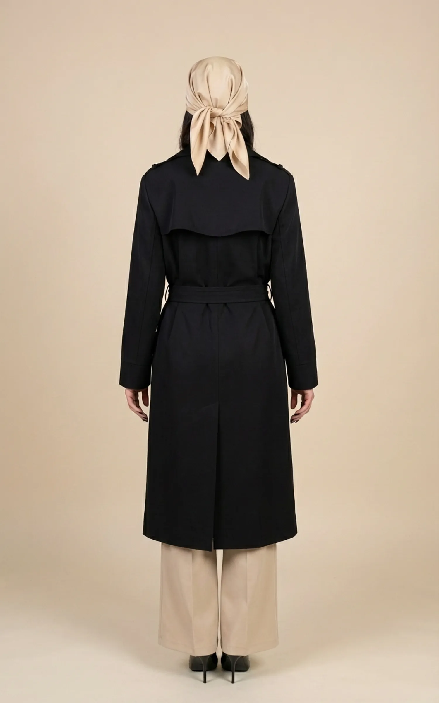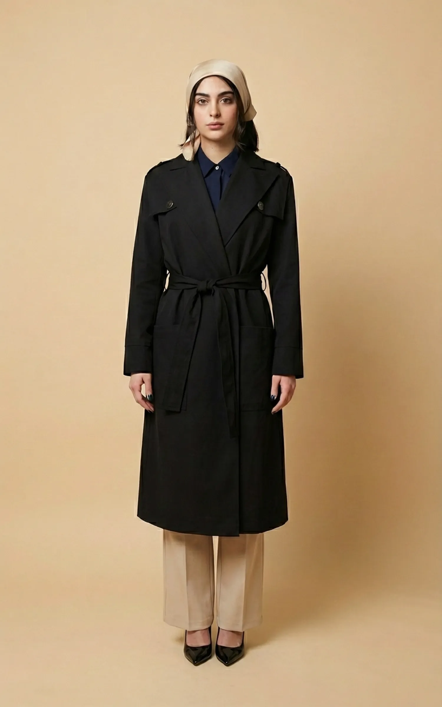 بارانی زنانه مشکی بلند کمردار با یقه انگلیسی نوادو کد 404132011765