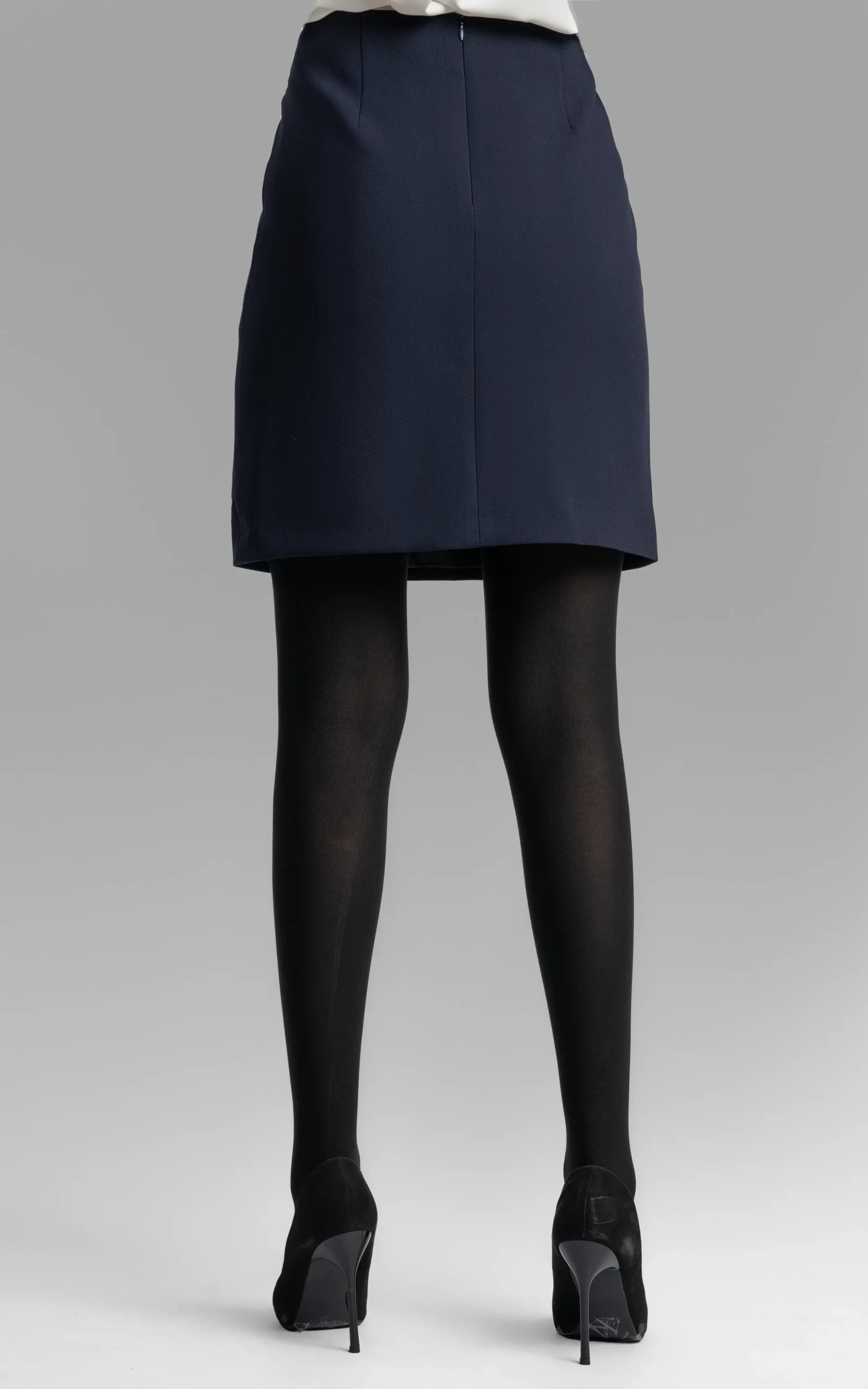 رنگ سرمهای این دامن زنانه به گونهای است که استایل آن به همراه کت ست کوتاه و سرمهای آن، به جذابیت پوشش بانوان شیک پوش در یک میهمانی مجلسی، میافزاید.