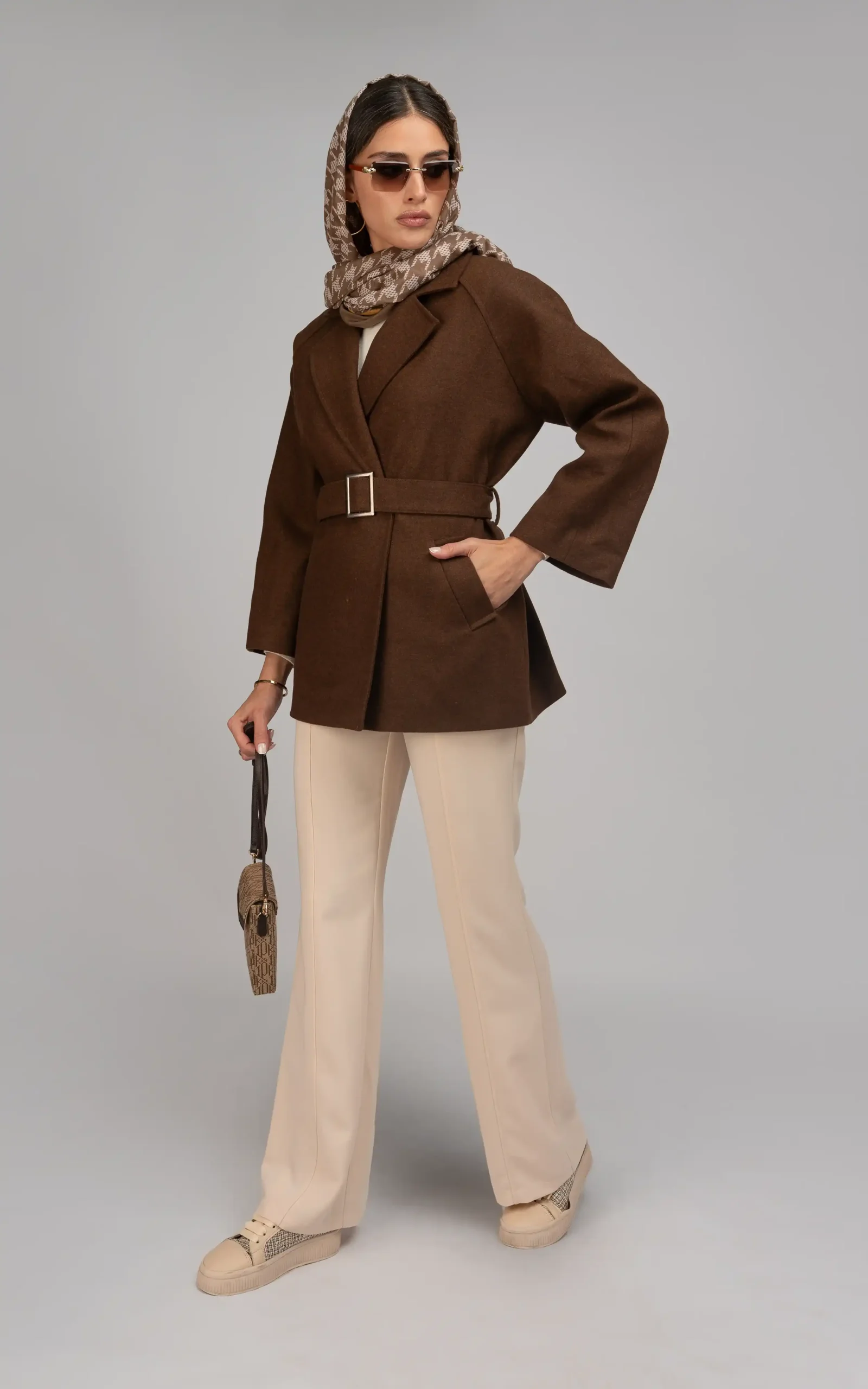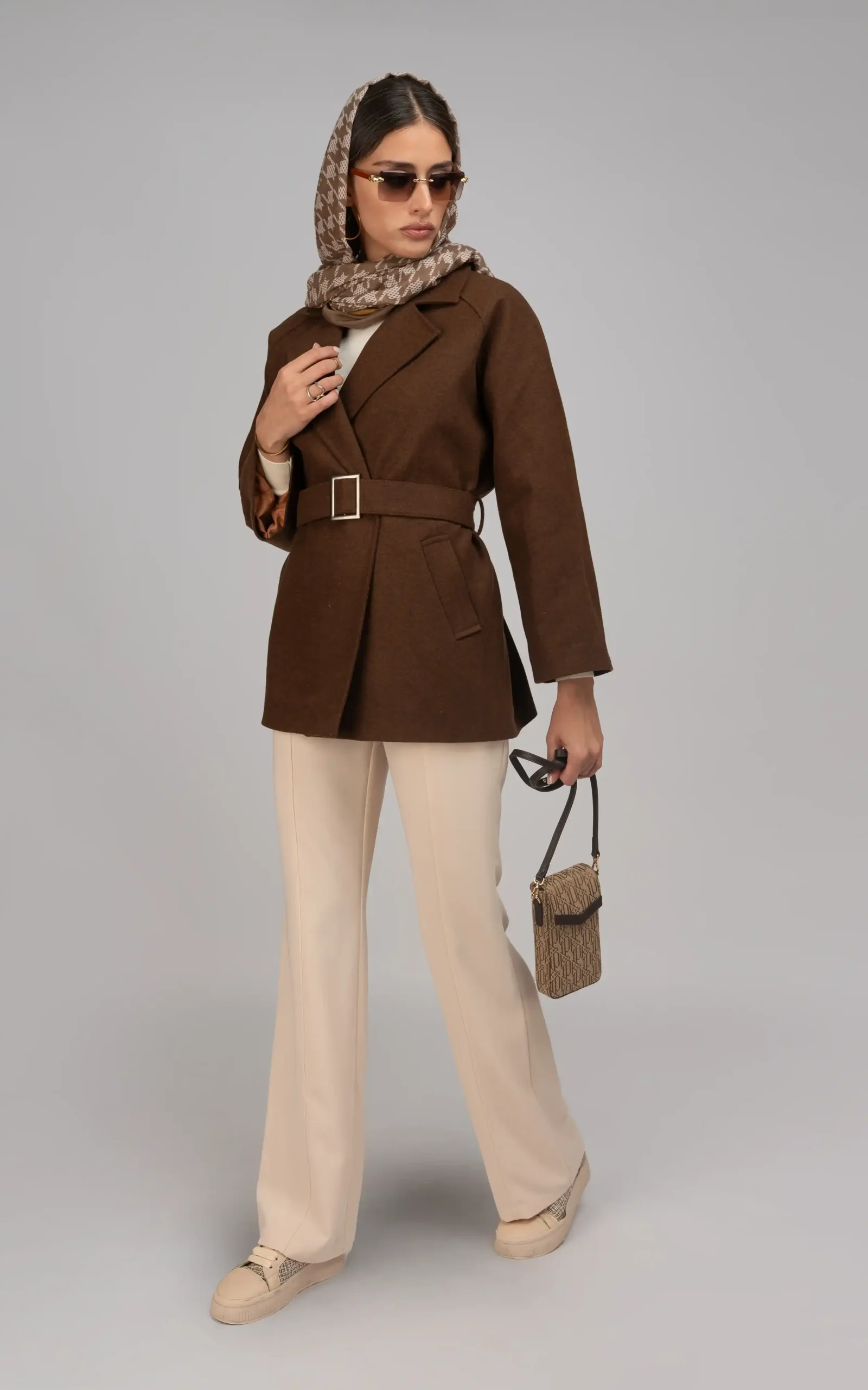 کمربند کار شده در نمای میانی این کت زنانه، به گونهای است که هم میتوان آنرا به صورت جلوبسته و هم به صورت جلوباز و به همراه یک بلوز ساده کرم، شیری یا بژ ست نمود.