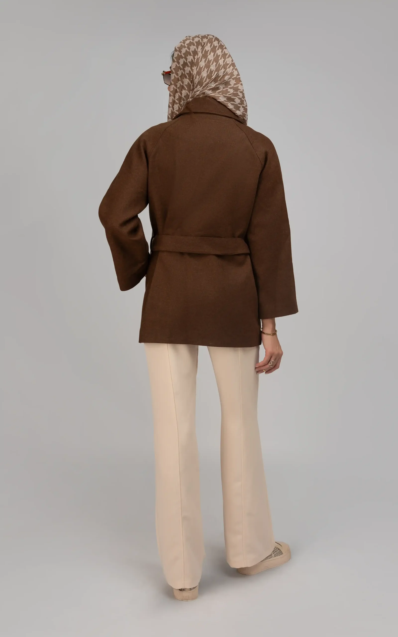 مدل جذب و کوتاه، رنگ گرم قهوهای و آستر کار شده در دوخت زیرین کت زنانه نوادو، یک انتخاب جذاب و ایدهآل پاییزی برای بانوان شیک پوش و علاقهمند به تناژ رنگی گرم و تیره است.