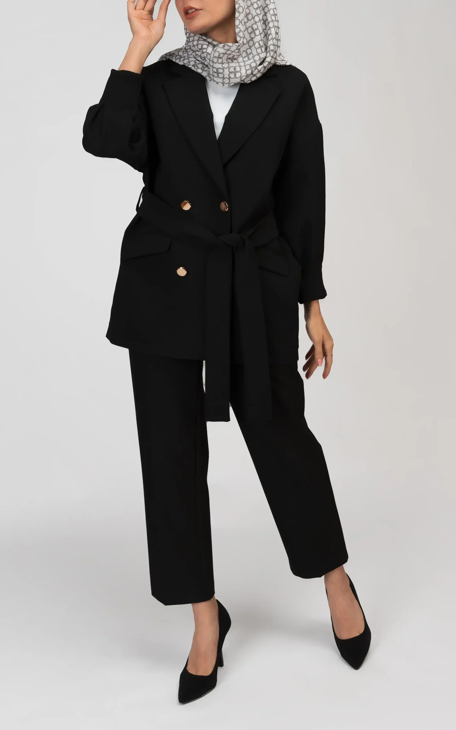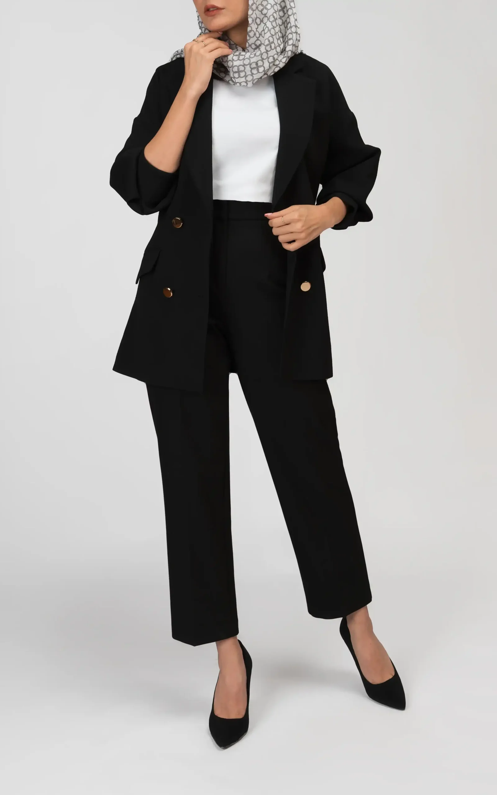 بلندای این کت شیک زنانه، نسبتا بر روی ران پا قرار میگیرد و ست آن به همراه شک شلوار پارچهای ساده و جذب در مدلهای متنوع ساق بلند، راسته یا ساق کوتاه و در تناژ رنگی مشکی یا رنگهای متضادی مانند قرمز یا زرشکی، زیبایی استایل این کت شیک زنانه را تکمیل میکند.