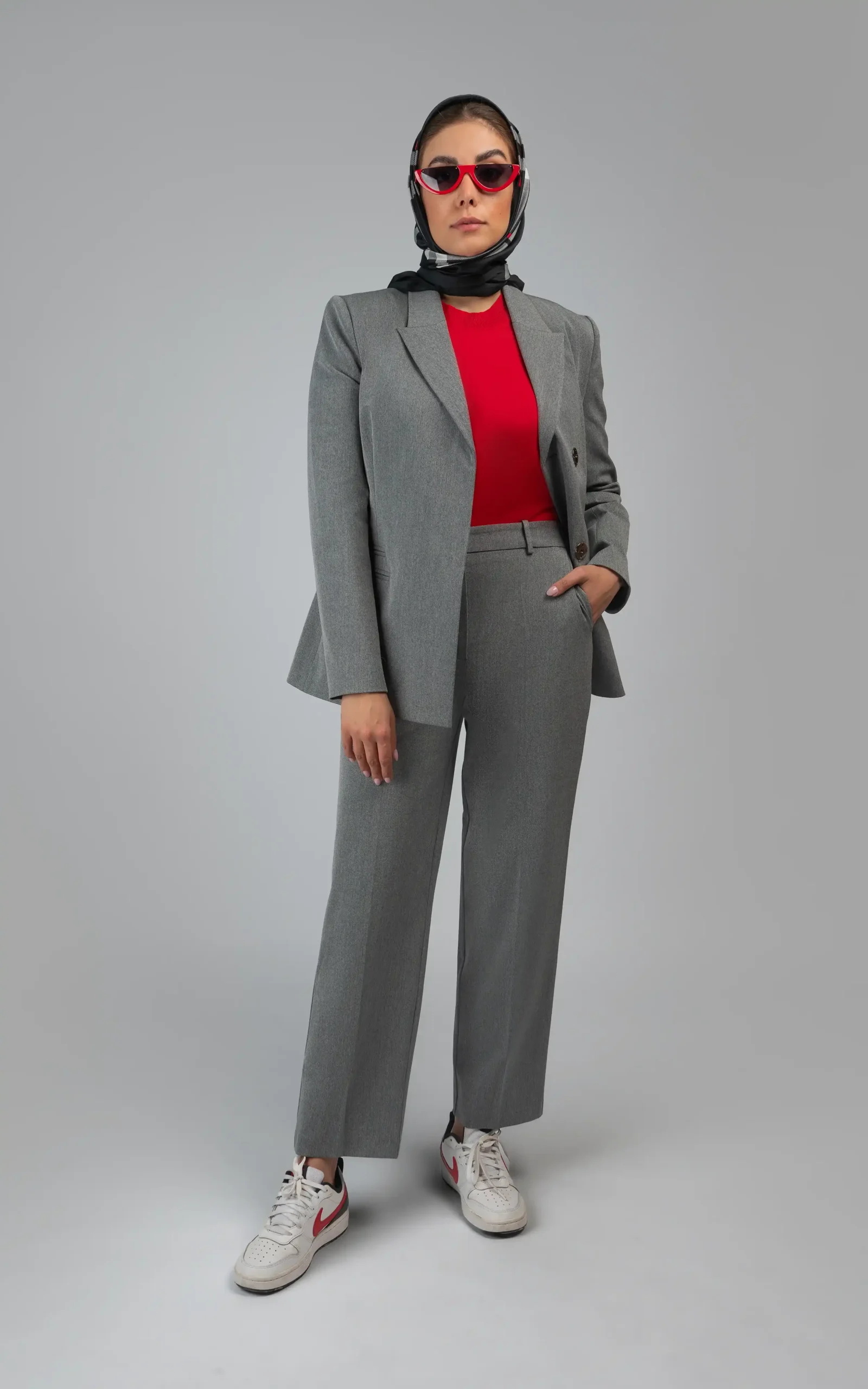 ست یک تاپ یا بلوز جذب و ساده در تناژ رنگی خاکستری یا رنگ متضادی مانند قرمز، نارنجی یا زرشکی به همراه شلوار طوسی مجلسی زنانه نوادو، ترکیب رنگی متضاد و جذابی را به استایل بانوان میبخشد.