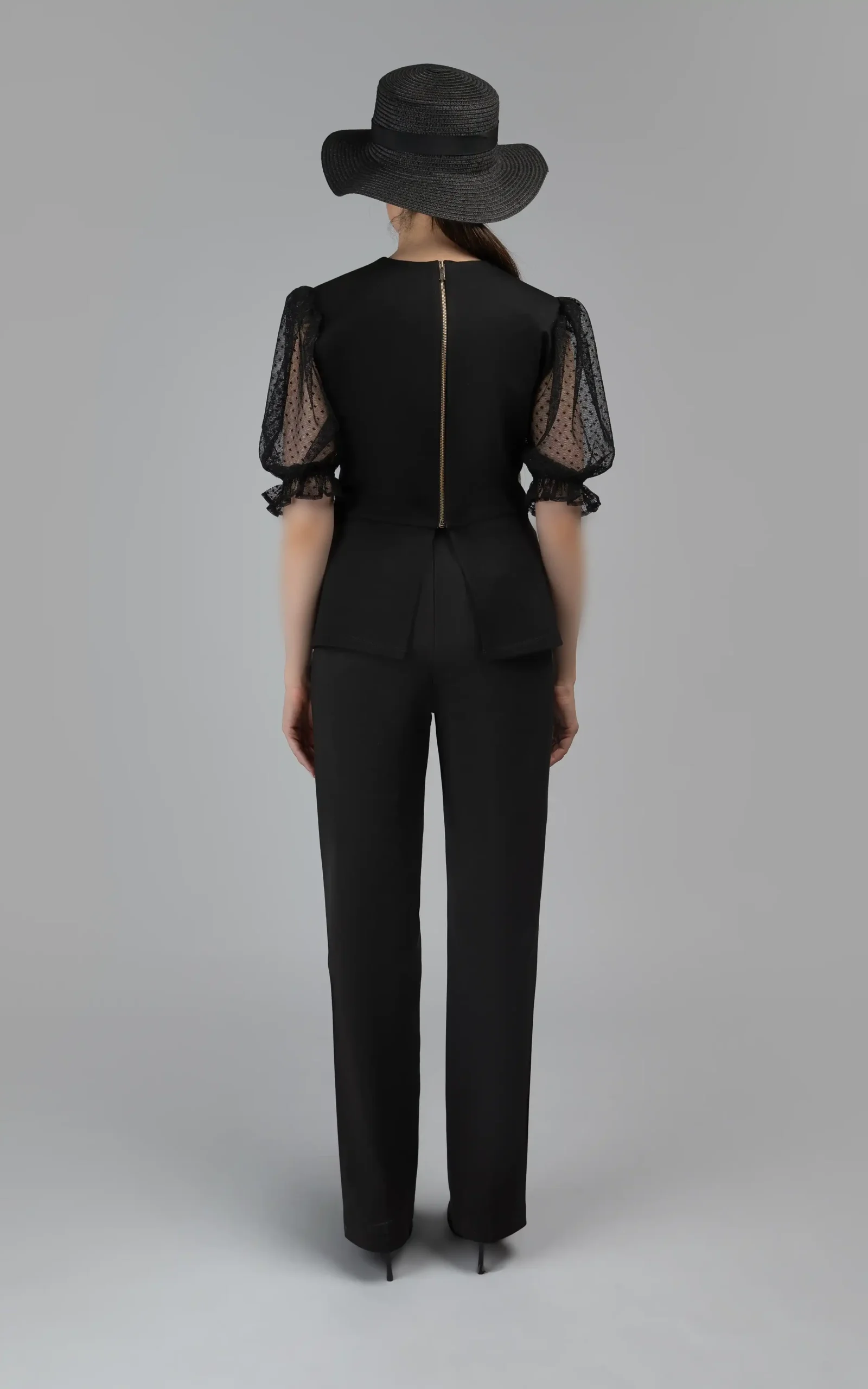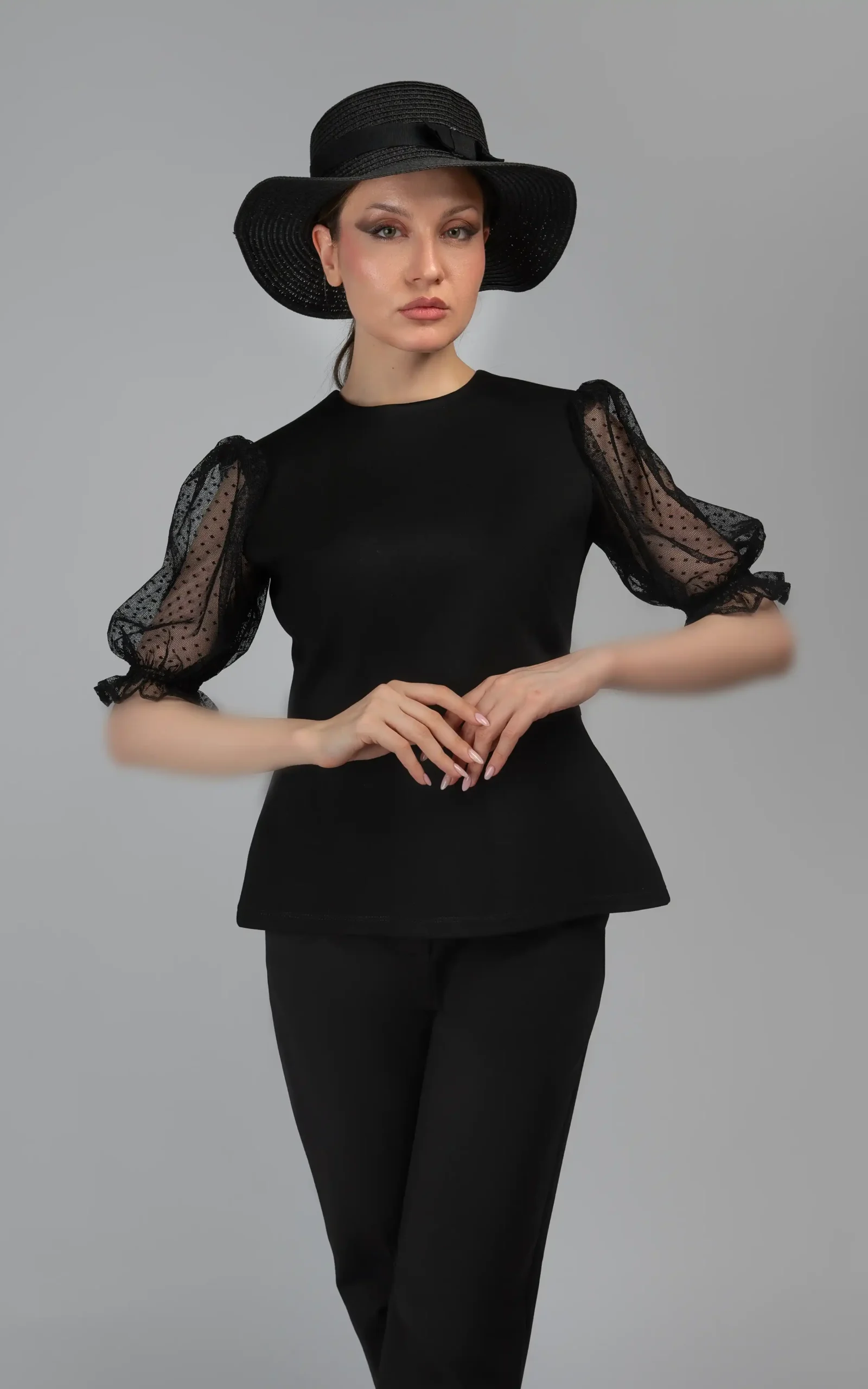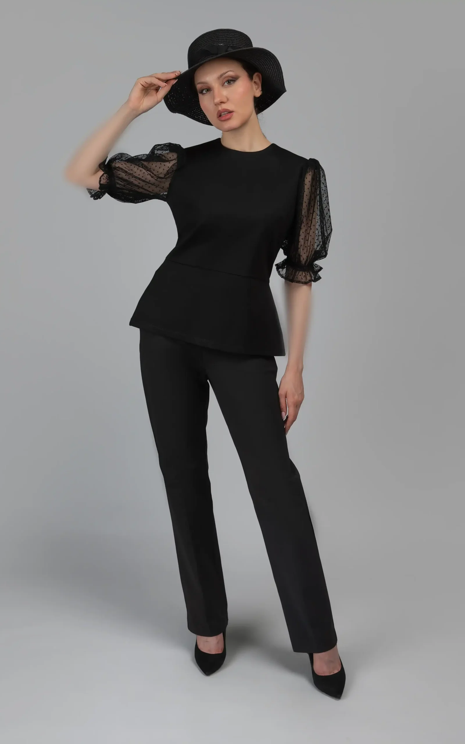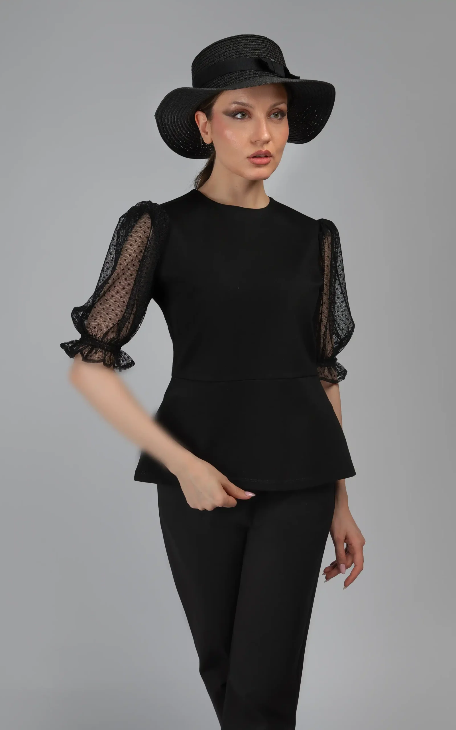 یقه گرد و ساده، آستینهای نسبتا بلند، گیپور و خالدار و سرآستینهای کشی ظریف و گلی شکل و مدل بلوز که تا قسمت کمر به صورت جذب و چسبان و از کمر به پایین به علت مدل کلوش و انتهای زاویه دار آن، به صورت کمی آزاد بر روی تن میایستد، زیبایی و جلوه این بلوز زنانه را چند برابر کرده است.