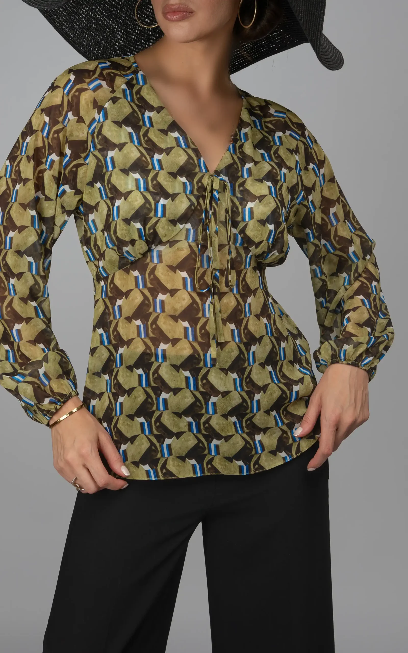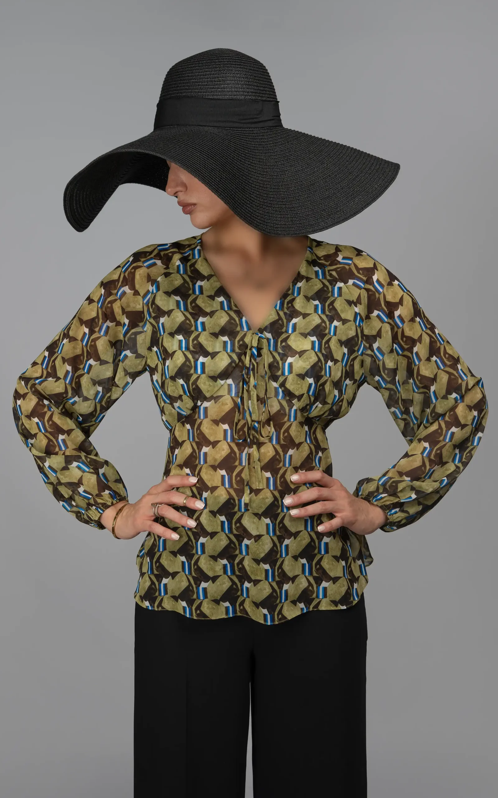 مدل طرحدار و تضاد رنگهای سبز ملایم، آبی و قهوهای کار شده در پارچه بلوز زنانه نوادو، یک انتخاب شاد و زیبا برای انواع میهمانیهای مجلسی و دوستانه است.