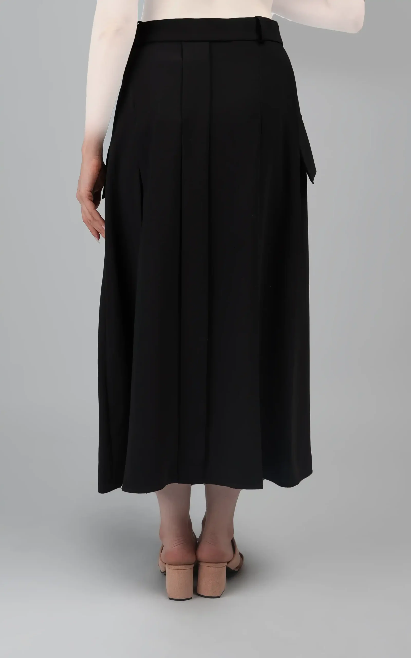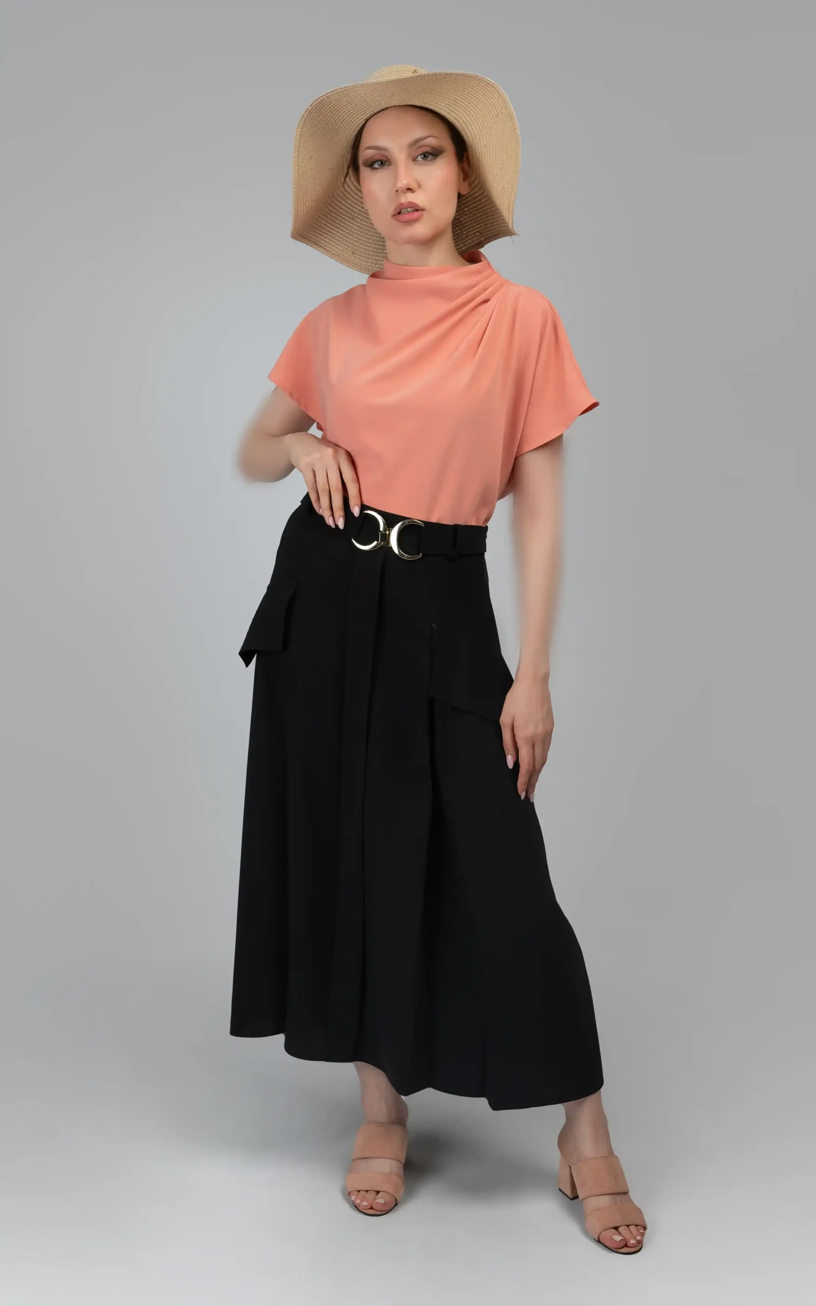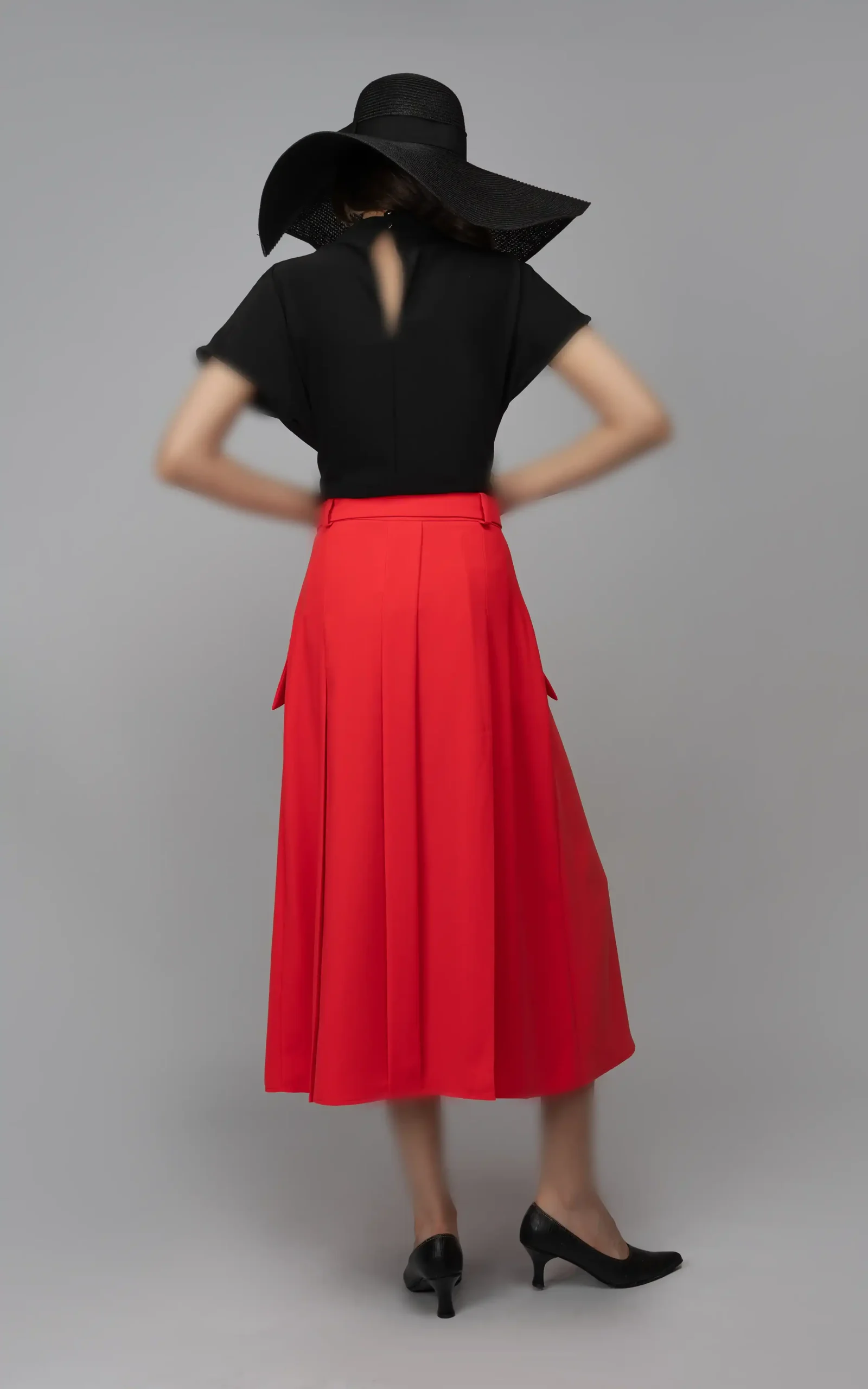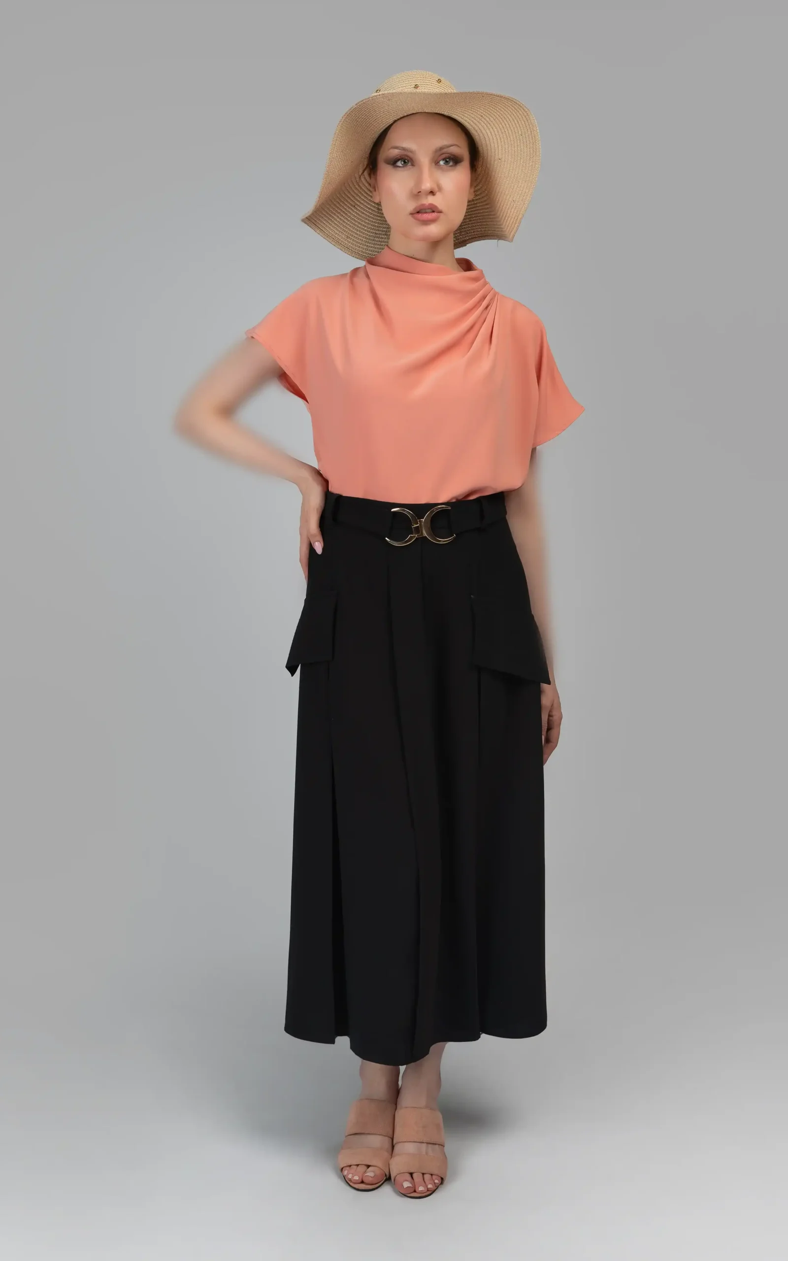 فاق بلند، کمربند ظریف، باریک و سگک دار کار شده از جنس و رنپ پارچه در نمای فاق، تک جیب نسبتا پهن و لبه پاکتی دوخته شده در نمای سمت چپ راست و مدل چیندار این دامن زنانه، به ظاهار زیبای آن افزوده است.
