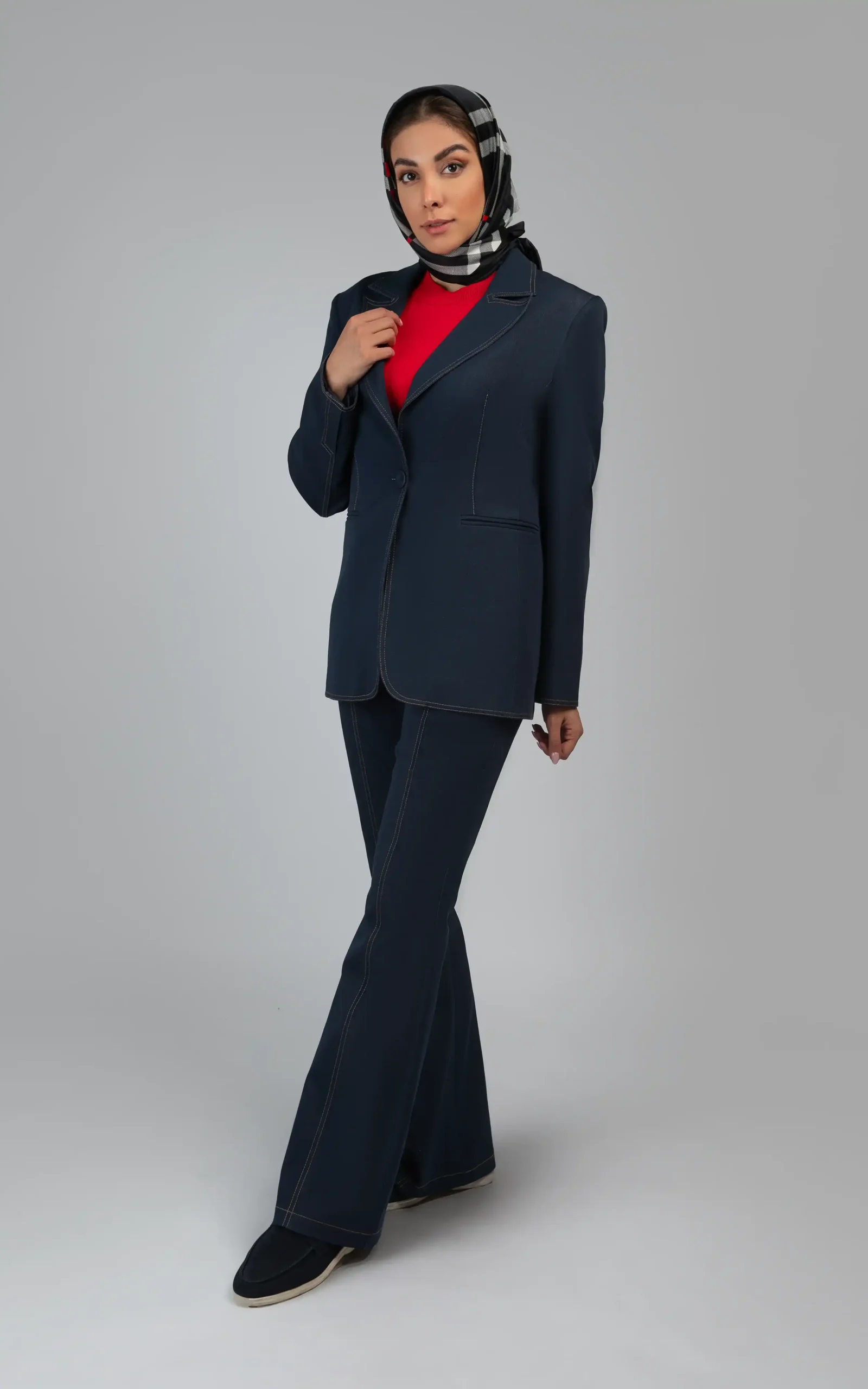 یقه انگلیسی باریک کار شده در نمای بالاتنه، آستینهای بلند و ساده، دو جیب ظریف و تزئینی کار شده در نمای کمر و دوخت لبه گرد حاشیههای کت در نمای انتهایی، به وقار و زیبای مدل آن افزوده است.