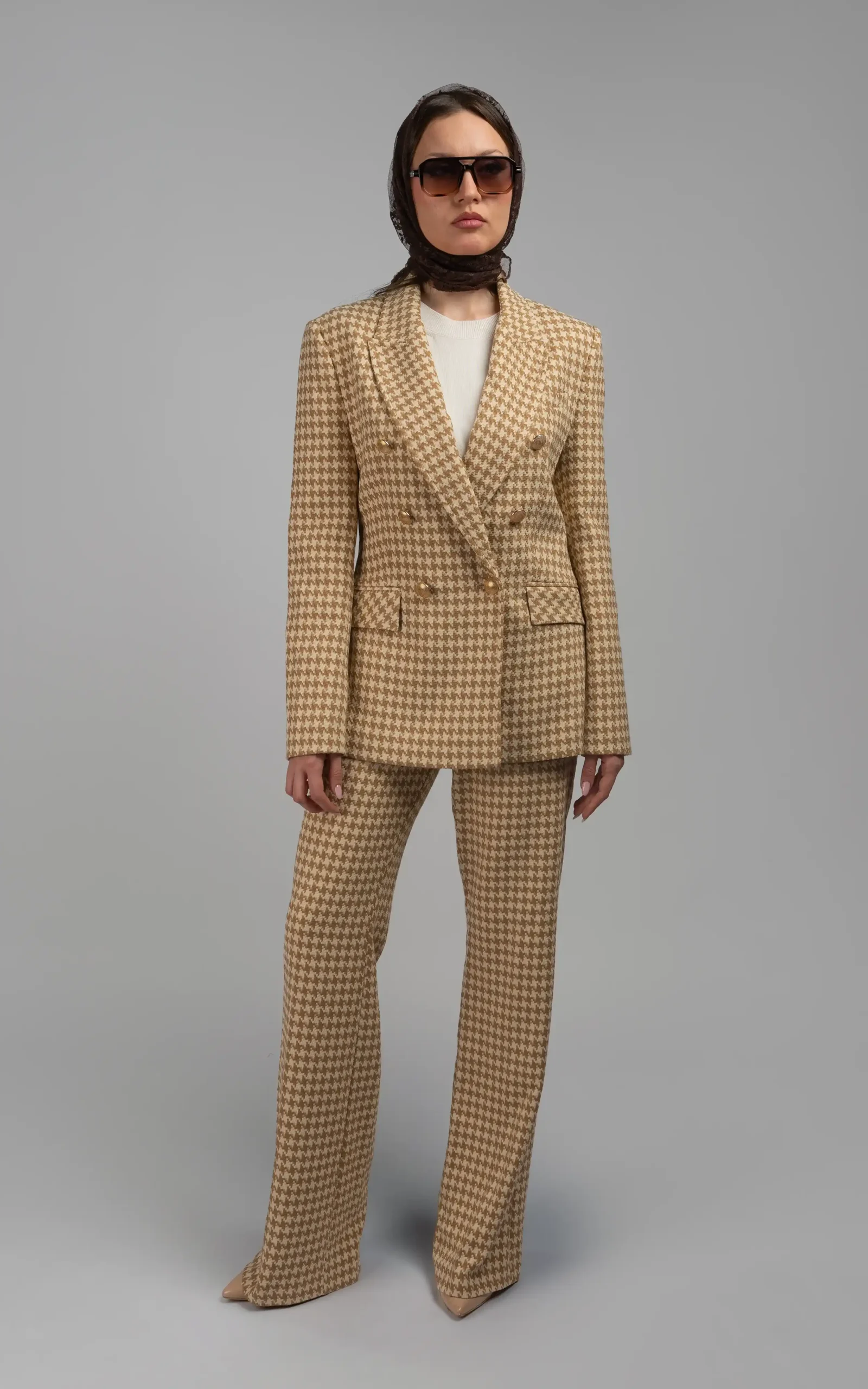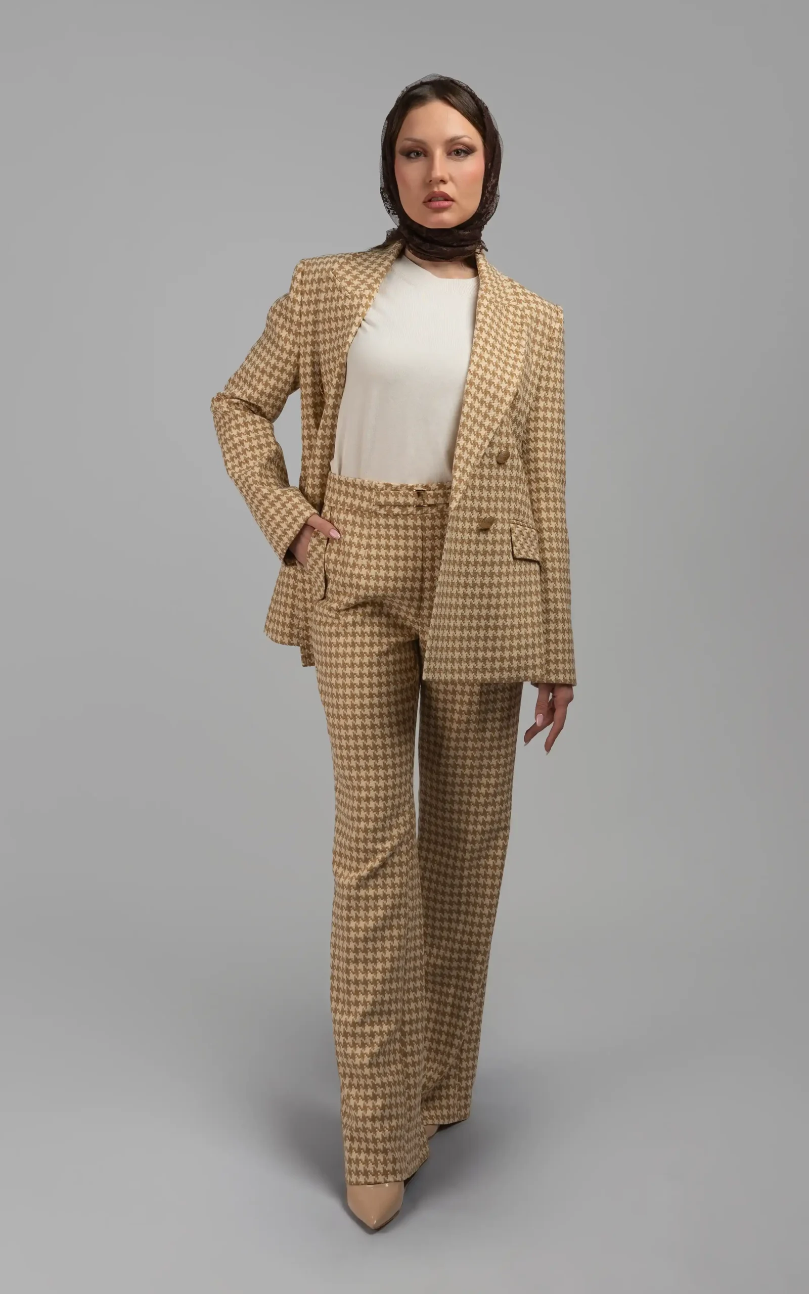 ست یک شلوار ساده و کرم یا قهوهای شکلاتی به همراه کت زنانه چهارخانه کرم-نسکافهای نوادو و یا استایل آن به همراه شلوار چهارخان، بلند دمپاگشاد ست آن، به زیبایی استایل مجلسی بانوان میافزاید.