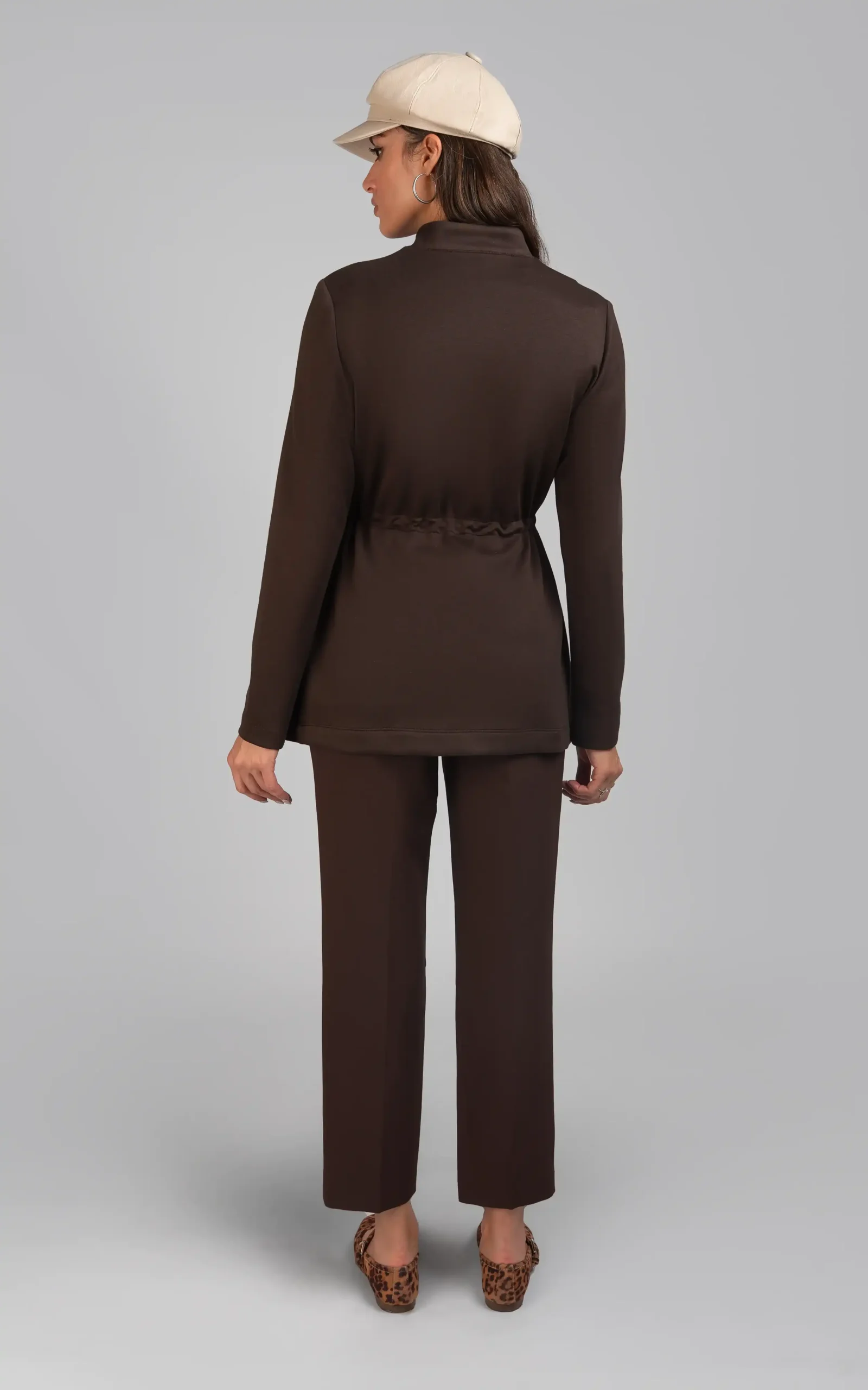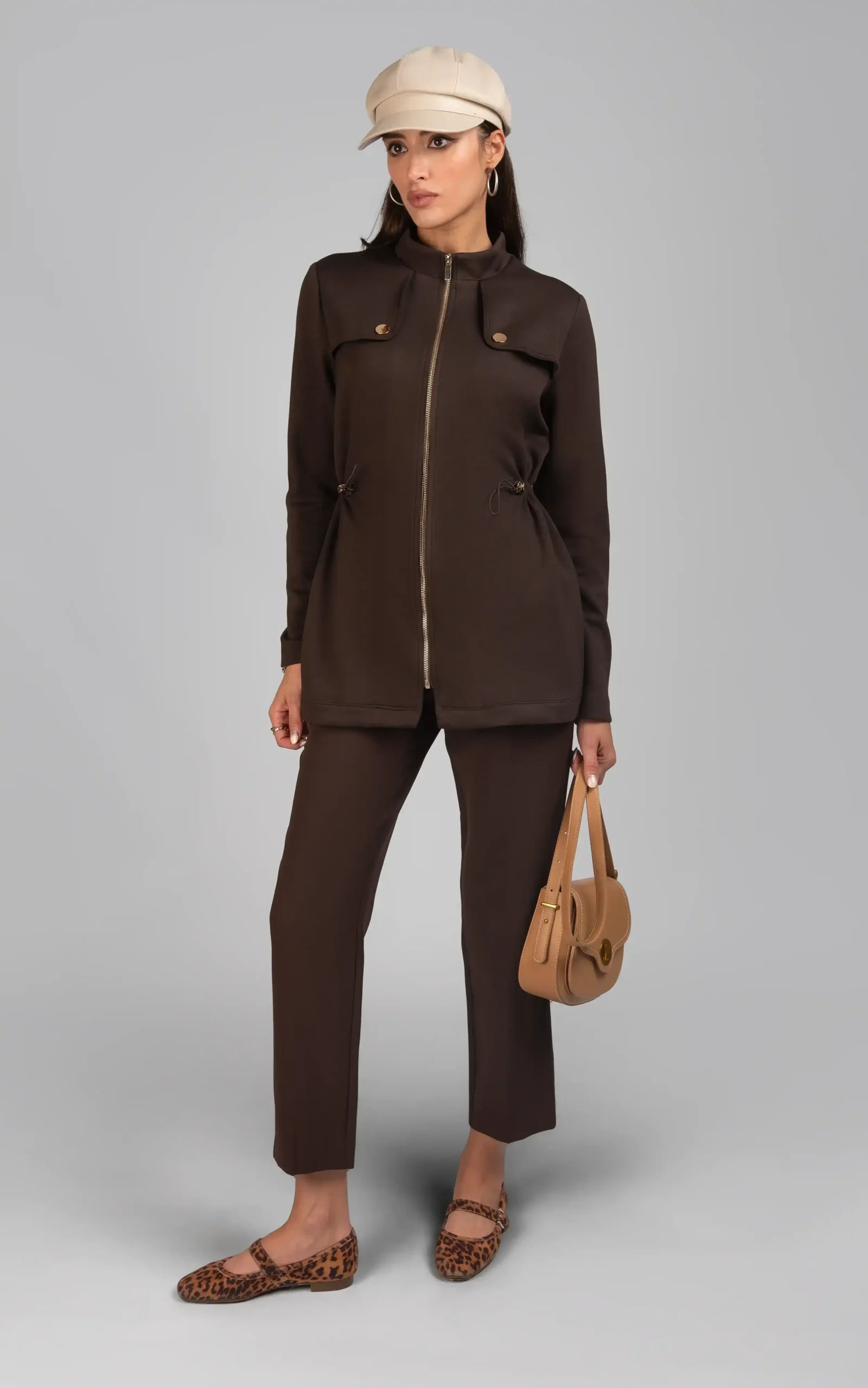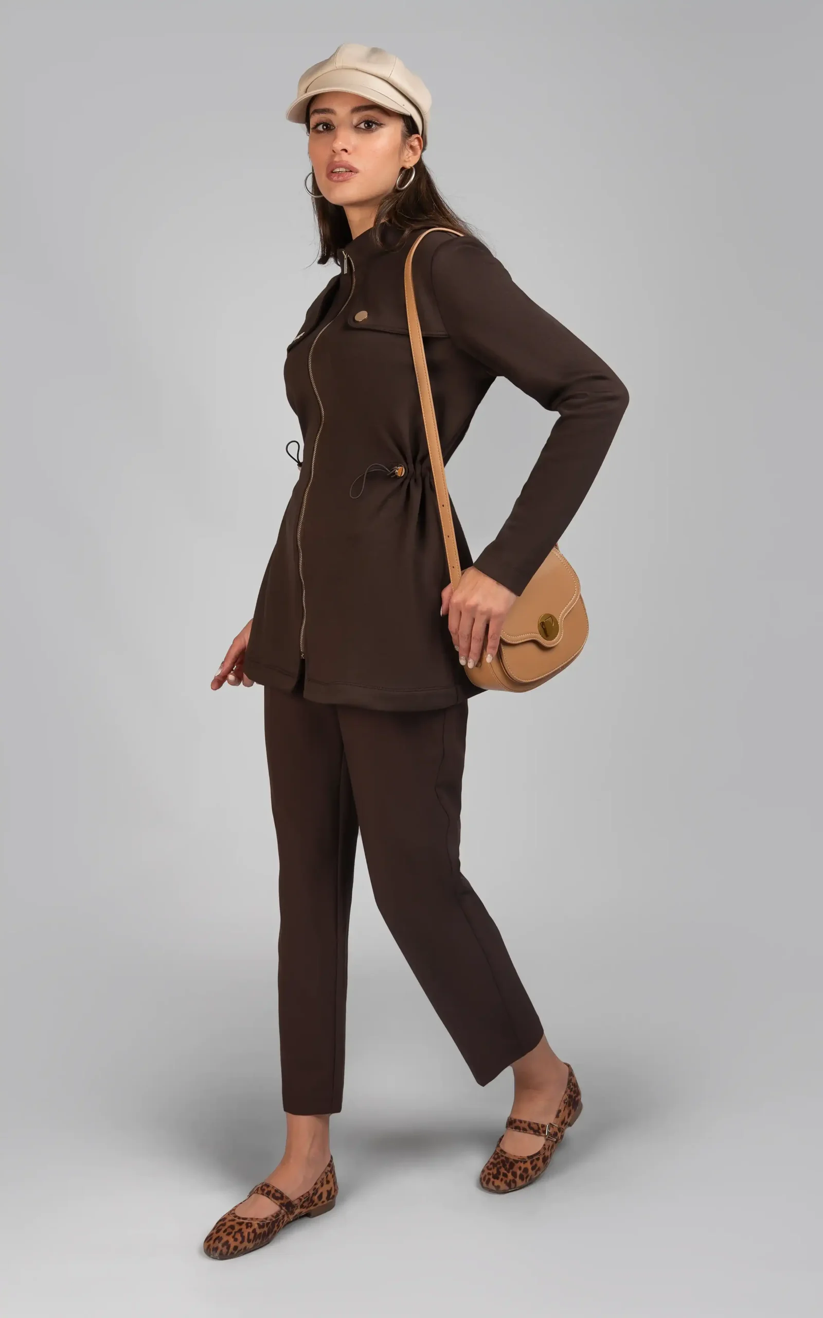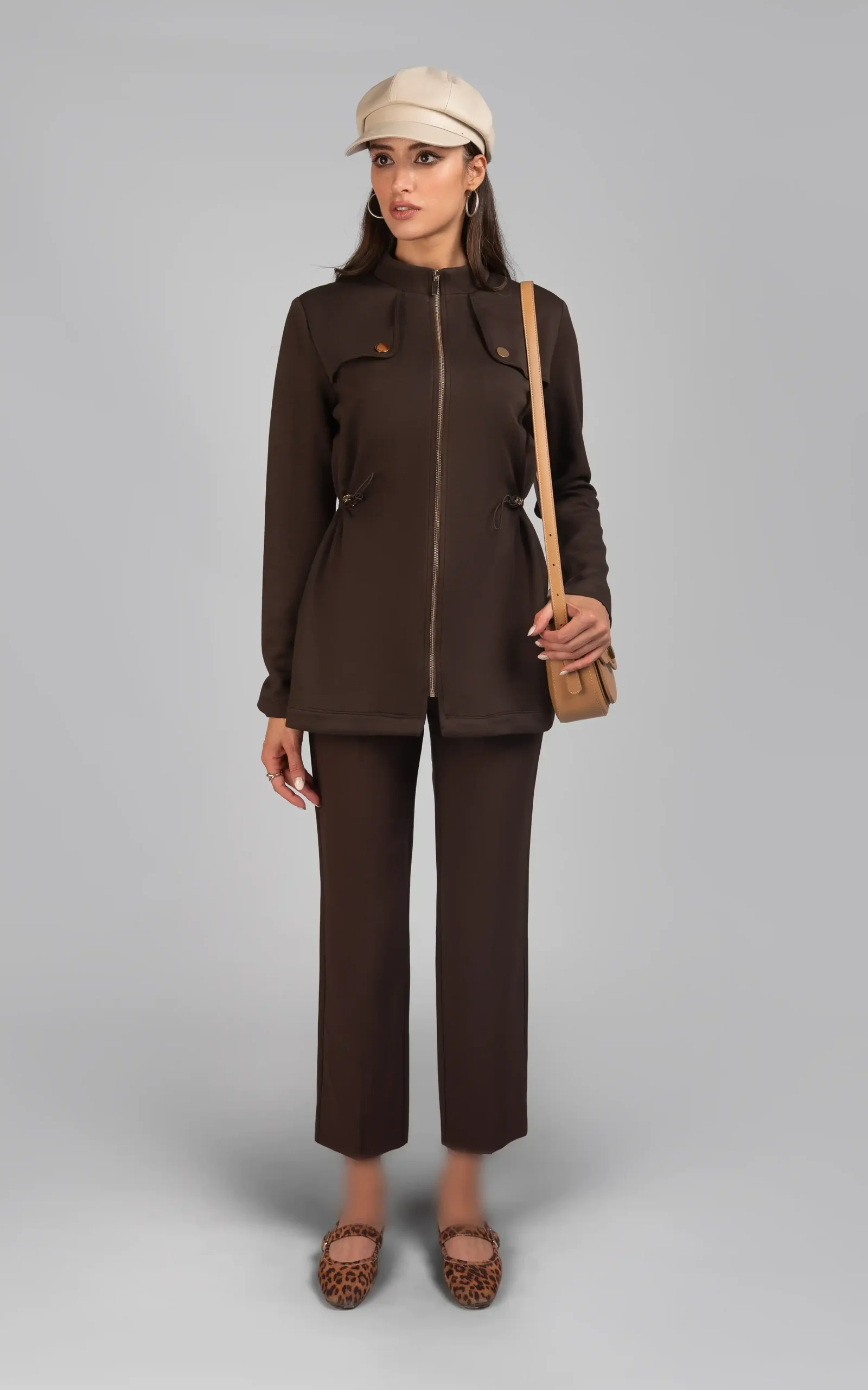 استایل این کت شیک پاییزی به همراه شلوار جذب، کوتاه و قهوهای شکلاتی ست آن، به جذابیت استایل بانوان خوش پوش، میافزاید.