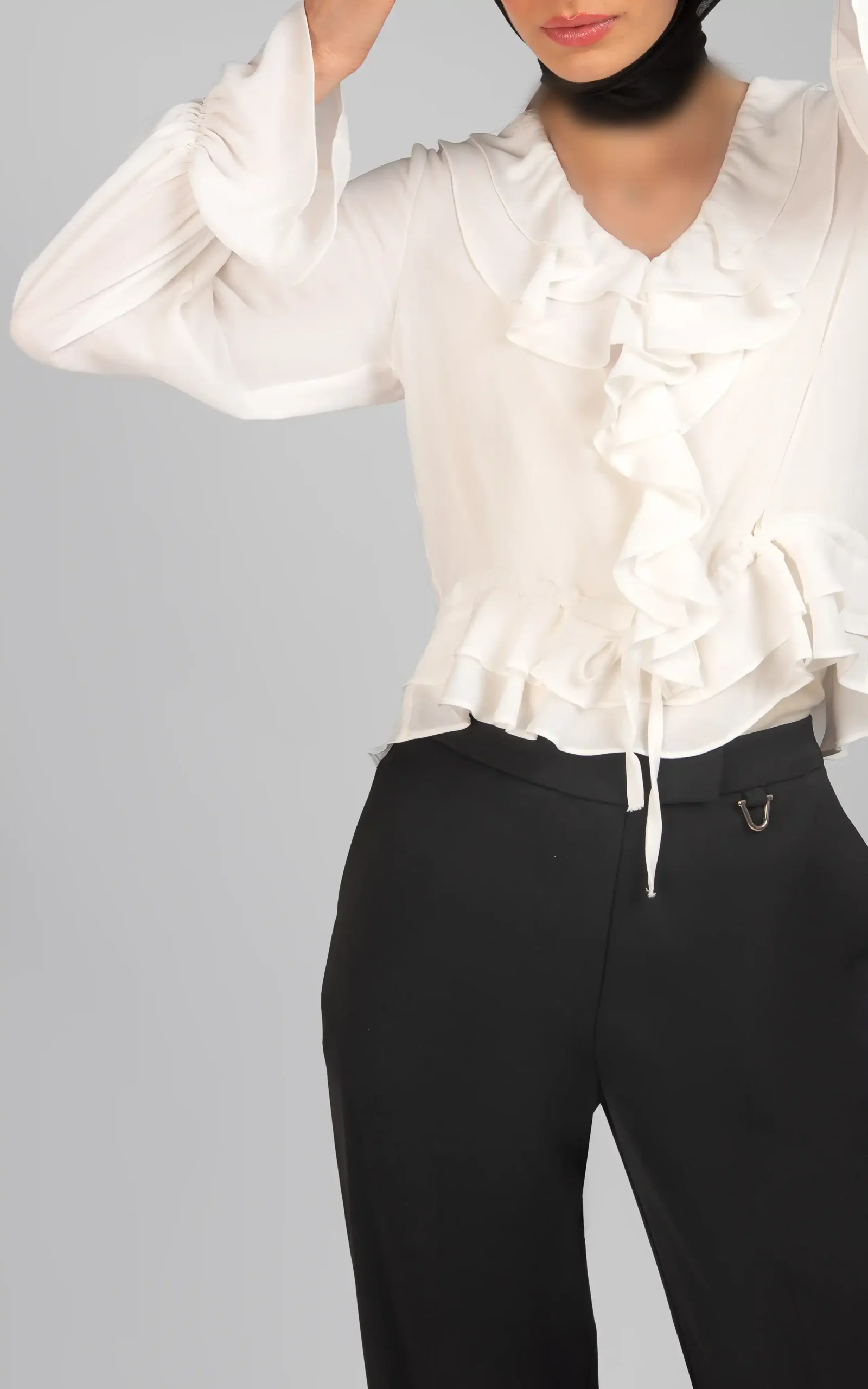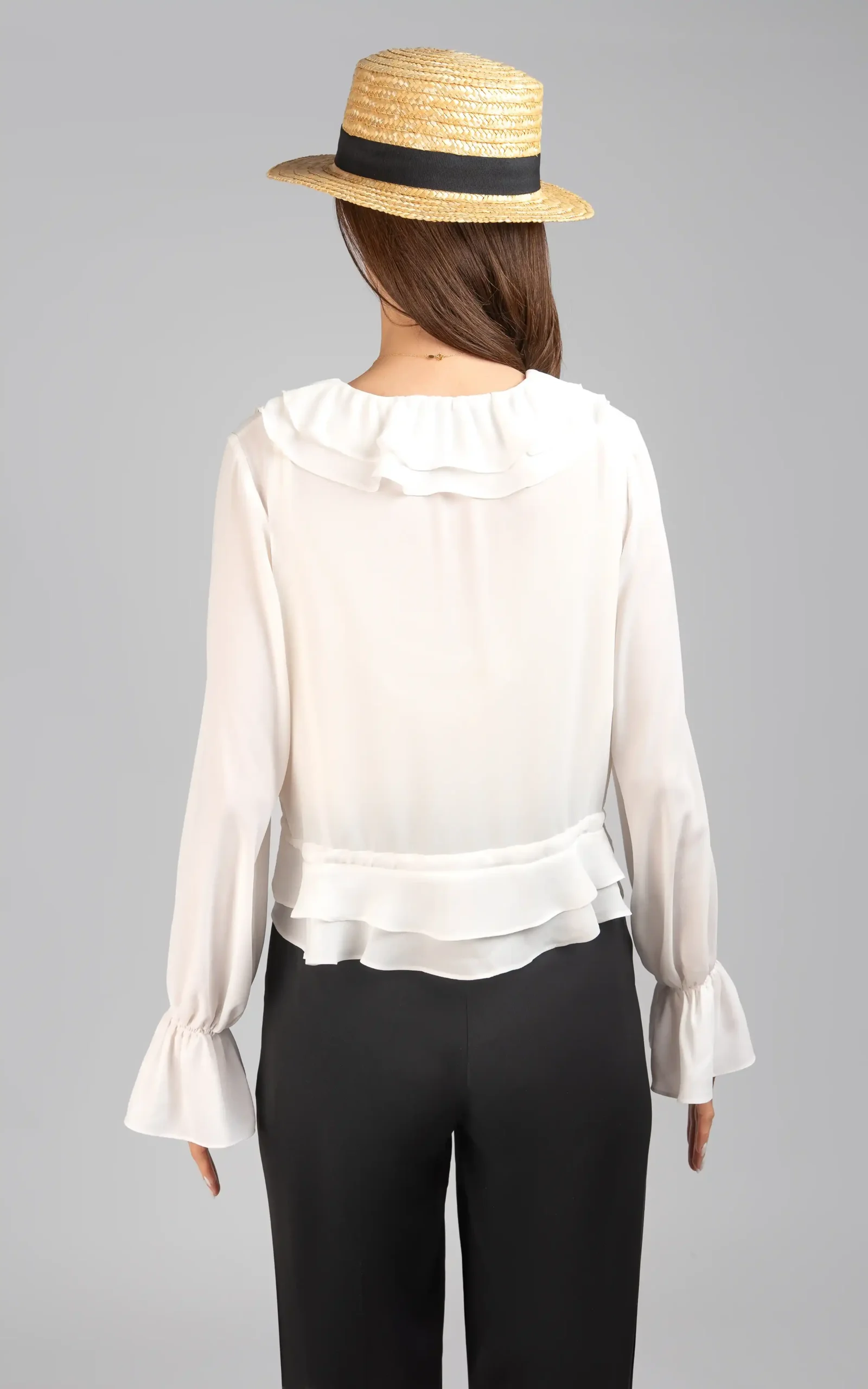 یقه هفت ساده، دوخت دو لایه لبه گرد و چینهای دالبوری شکل کار شده در امتداد آن در نمای پیشین، آستینهای بلند و سرآستینهای گلی شکل و نمای دو لایه و دالبوری شکل قسمت انتهایی بلوز، جلوه عروسکی ظریفی را به مدل آن بخشیده است.