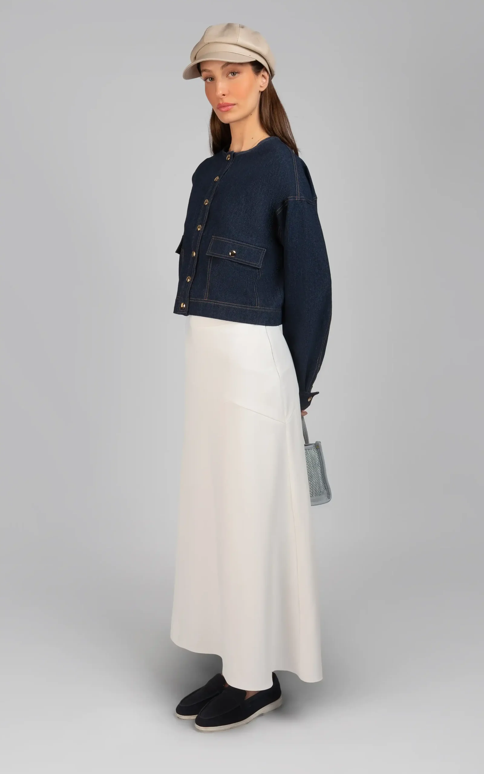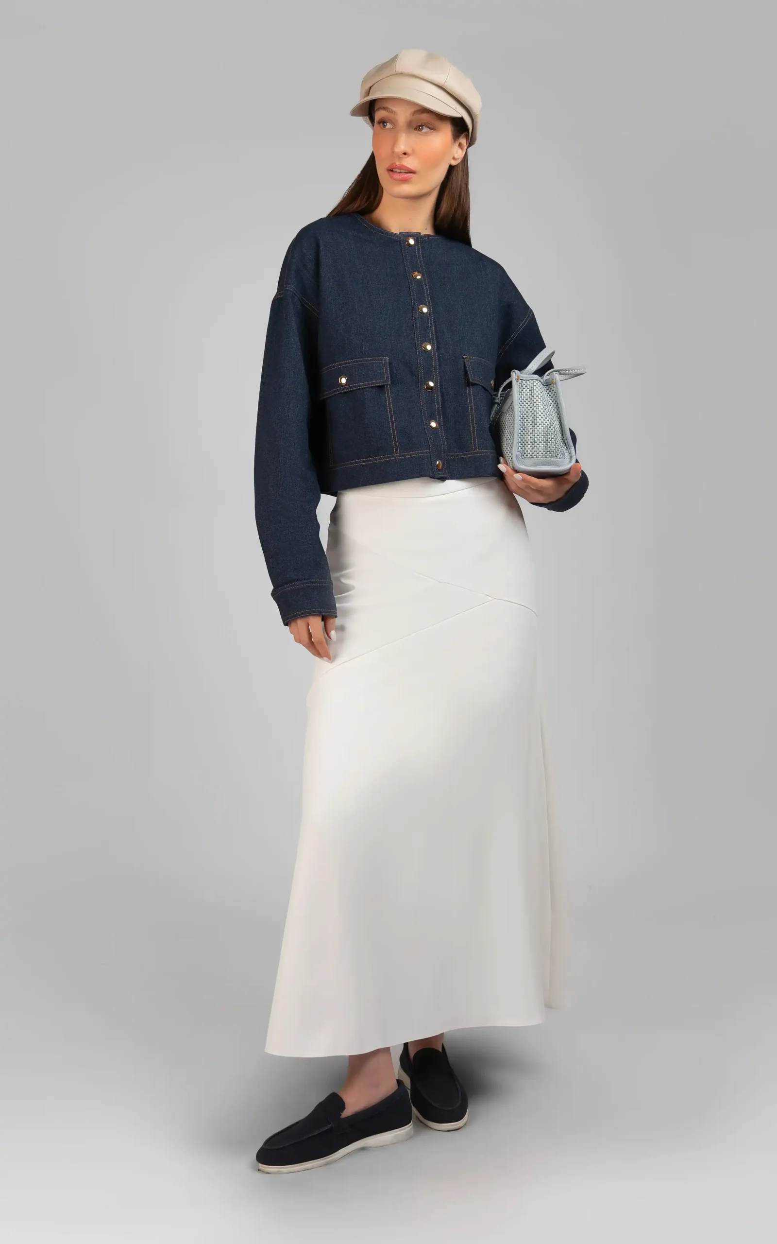 مدل ساده و راسته دامن زنانه سفید رنگ نوادو به گونهای است که هم میتوان آنرا به همراه به صورت یک استایل مجلسی و هم به صورت یک استایل اسپرت با انواع بلوز و شومیزهای مجلسی و اسپرت ست نمود.